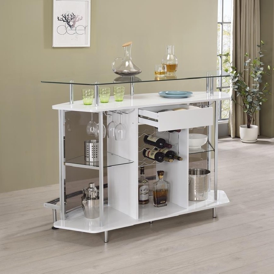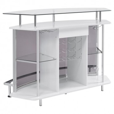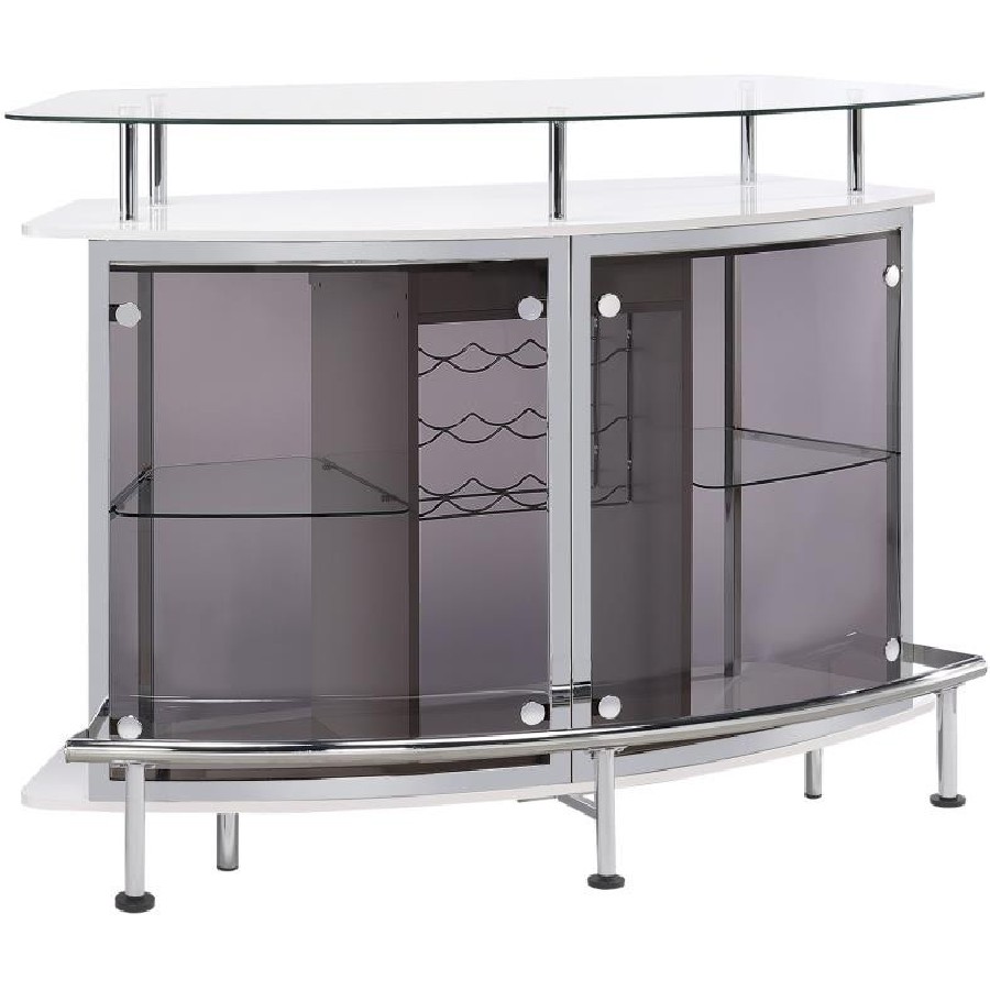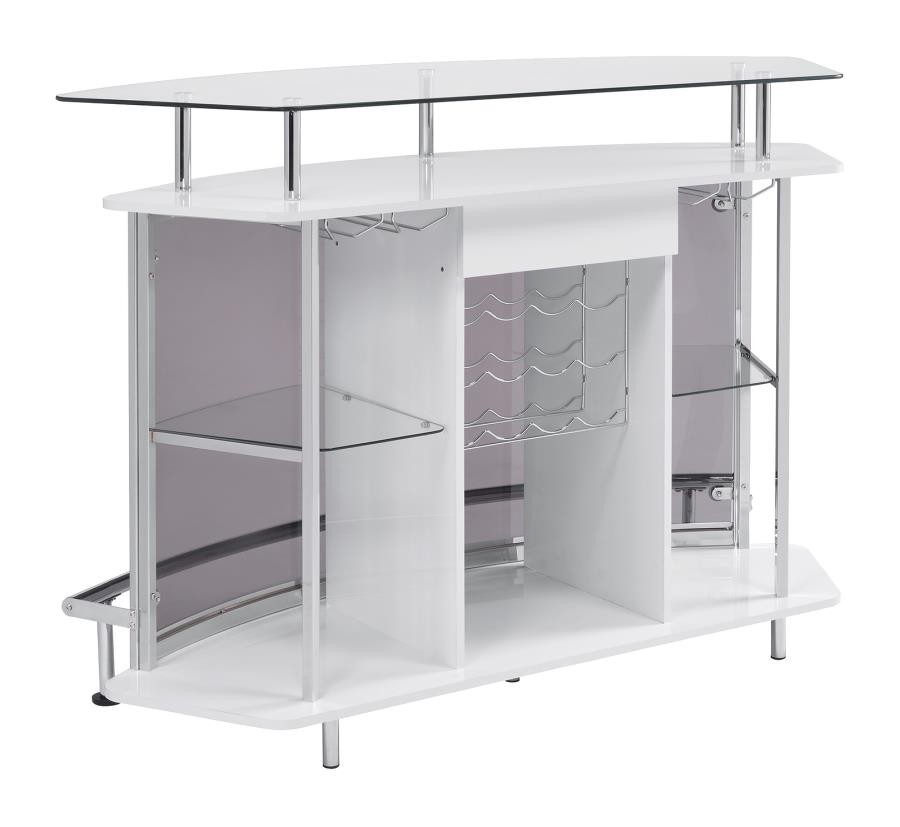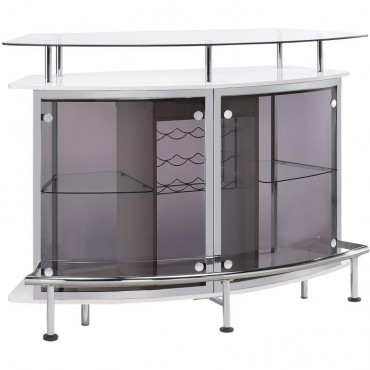 Chic with striking mixed material design, this contemporary bar unit elevates a modern style home. With a curved shape, this bar unit works perfectly in the corner of a media room or dining space, offering a place for guests to conjure together and serve themselves. A beautiful finish offers a classy touch and glam vibe, while a clear tempered glass top floats above, offering ample space to store barware and tumblers. Two smoked acrylic front panels showcase hanging stemware racks and libations, displaying what you have available. In addition, guests can slide up a stool or stand comfortably, resting along a steel footrest.