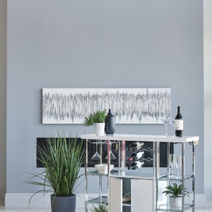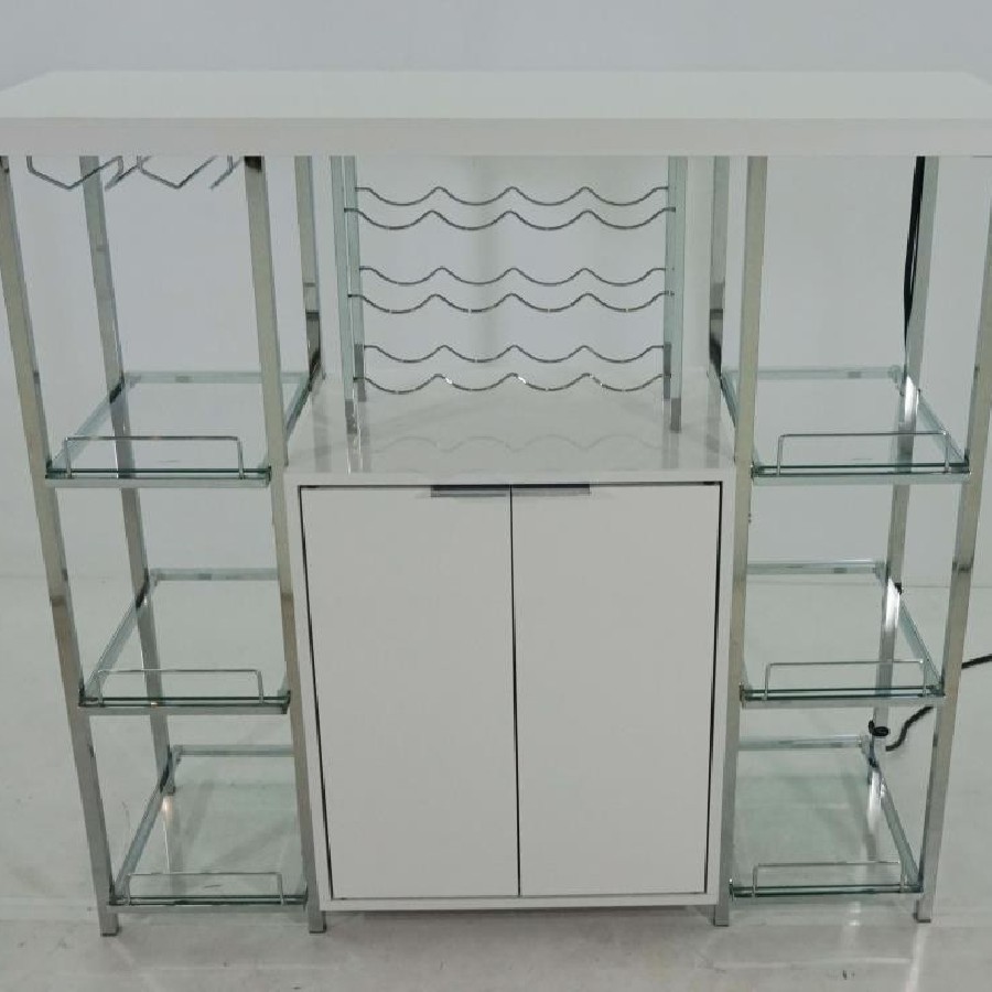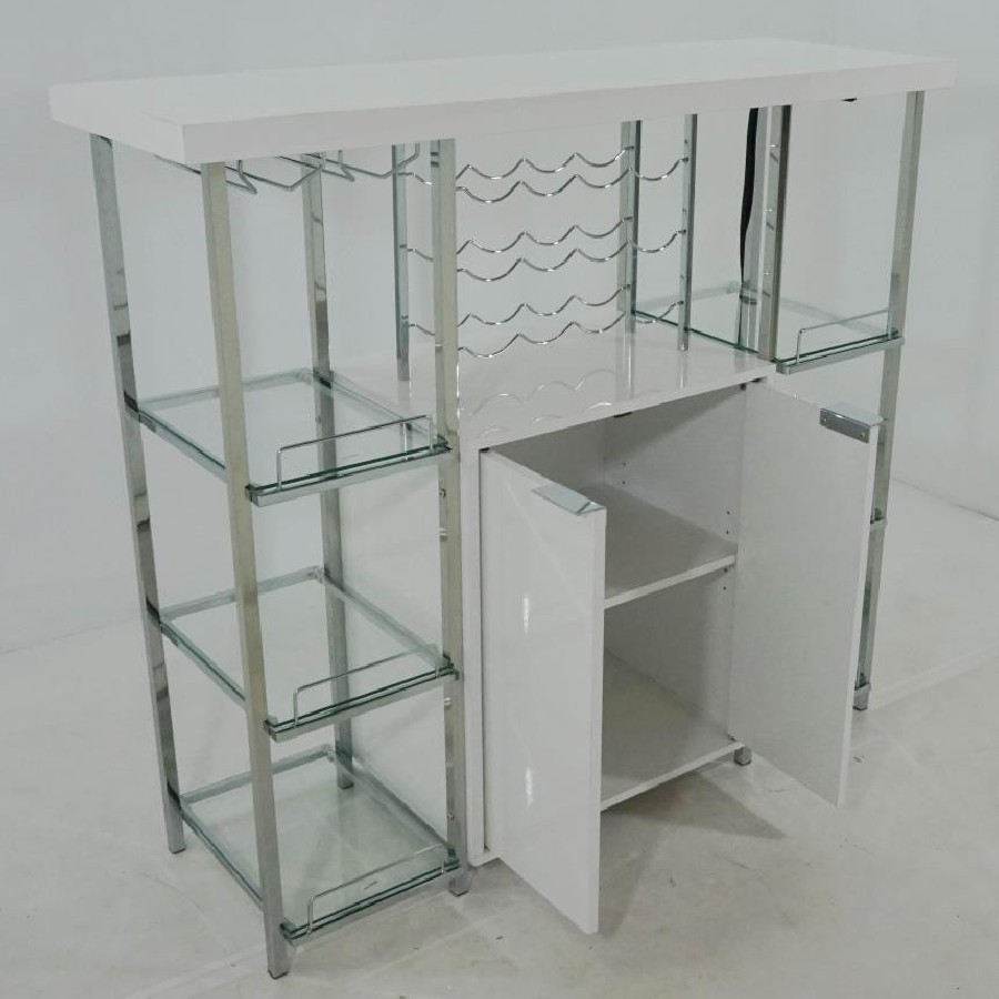 Cool and contemporary, this white bar cabinet exudes modern elegance. Crafted with sleek, shining lines of metal electroplated in chrome, it has a posh, polished look that will make your decor pop. Six tempered glass shelves and a stemware rack provide ample space for barware and wine glasses. A generous, two-door cabinet provides even more storage space. Complete with a wine rack with room for 12 bottles, this contemporary bar unit has everything you need for a complete home bar setup.