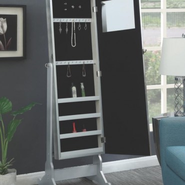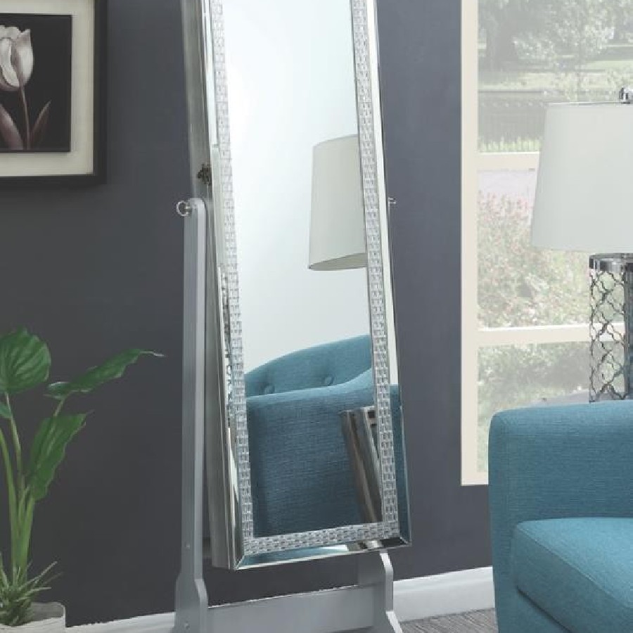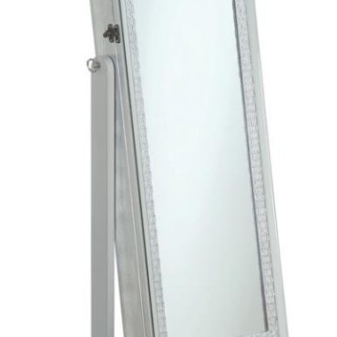 Combine beauty with function to create the perfect bedroom addition. This cheval jewelry mirror is truly an inspired choice, offering a beautiful silver finish to enliven any decor. The rectangular mirror features a lovely border sure to draw attention. Resting in a stand, the mirror tilts to create the perfect angle. Plentiful jewelry storage within makes dressing in the morning or evening a snap.