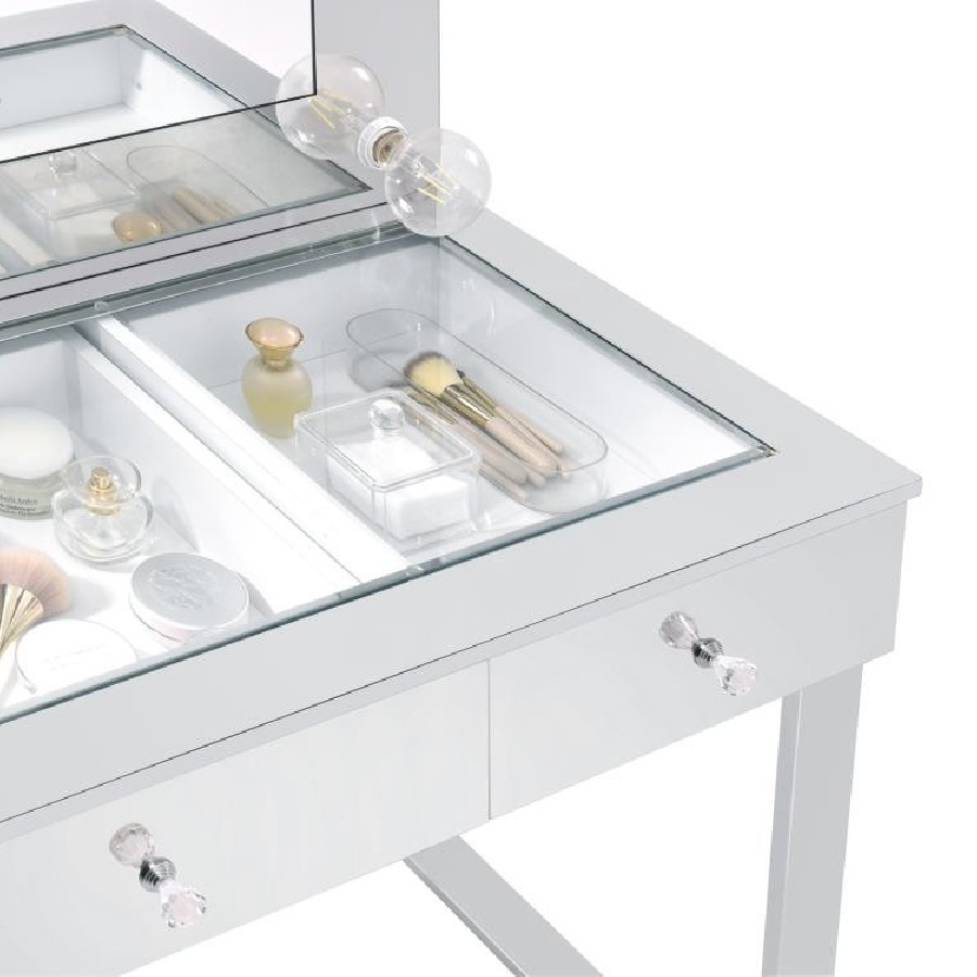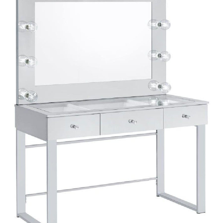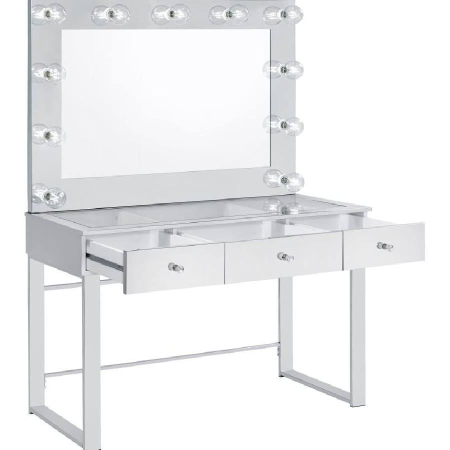 With a Hollywood regency flair, this modern vanity set features a stunning mirror paneled design that reflects surrounding hues. Cleverly designed with a clear tempered glass top that showcases cosmetics and accessories tucked inside the three drawers beneath, this vanity offers a unique functionality. Adorned on each of the three bright white drawers are crystal-like acrylic pulls, further lending to its dramatic glam flair. Mounted on the back is an oversized mirror framed in a mirror-like polished chrome metal finish, complete with a series of retro-inspired, Edison-style LED bulbs. Constructed with a heavy gauge steel base, this vanity set is made to last.
