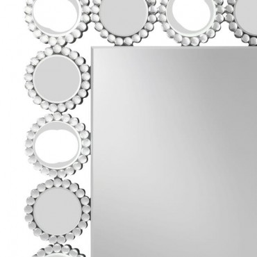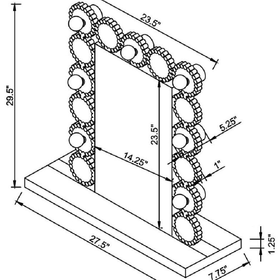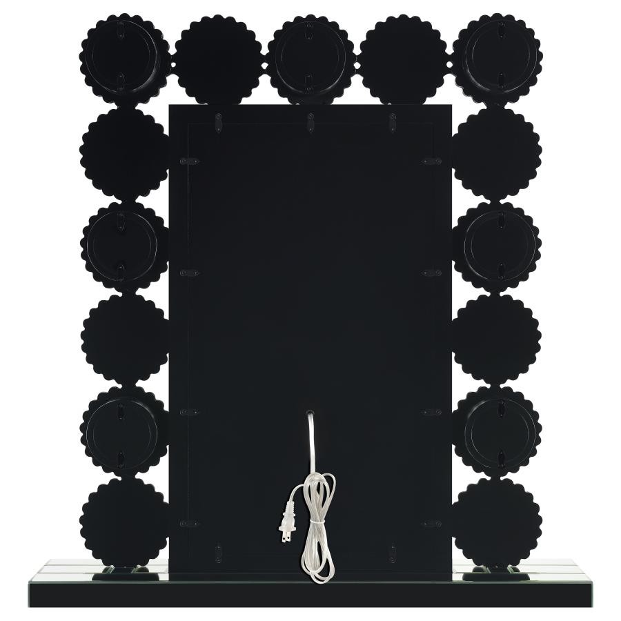 Rest this contemporary table mirror along a dresser or vanity surface for a playful, elegant aesthetic. Surrounded by seven LED bulbs that provide a soft, bright glow for perfecting your glow up, this table mirror offers a dramatic statement piece for bedrooms, bathrooms and more. The Hollywood inspired frame is bordered by individual round mirror tiles, each further framed in sparkling mirror trim. Bold lines and sophisticated mirror plates merge to offer a modern touch. A thick base also provides extra stability and support.