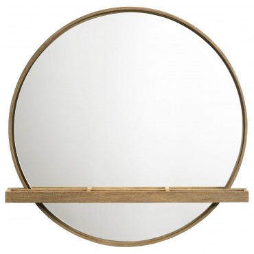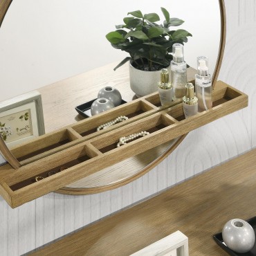 This wall-mounted vanity mirror blends modern sophistication with natural coastal warmth. A round wood frame in a soft sand wash finish highlights subtle wood grain texture, while a built-in shelf with a raised-edge jewelry tray offers space for perfumes, cosmetics, or accessories. Designed for both beauty and function, it keeps essentials within reach while maintaining a clutter-free appearance. Ideal for bedrooms, dressing areas, or entryways, this mirror adds depth and serene style to any space.