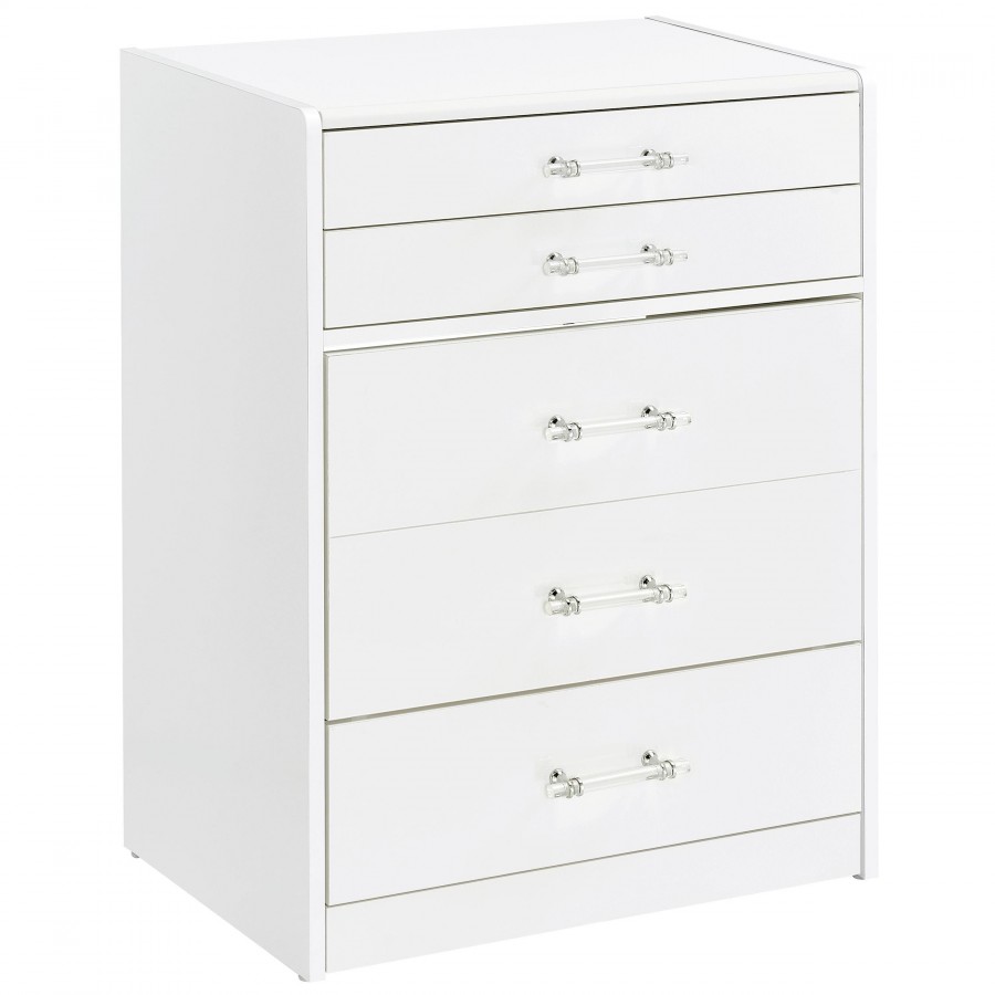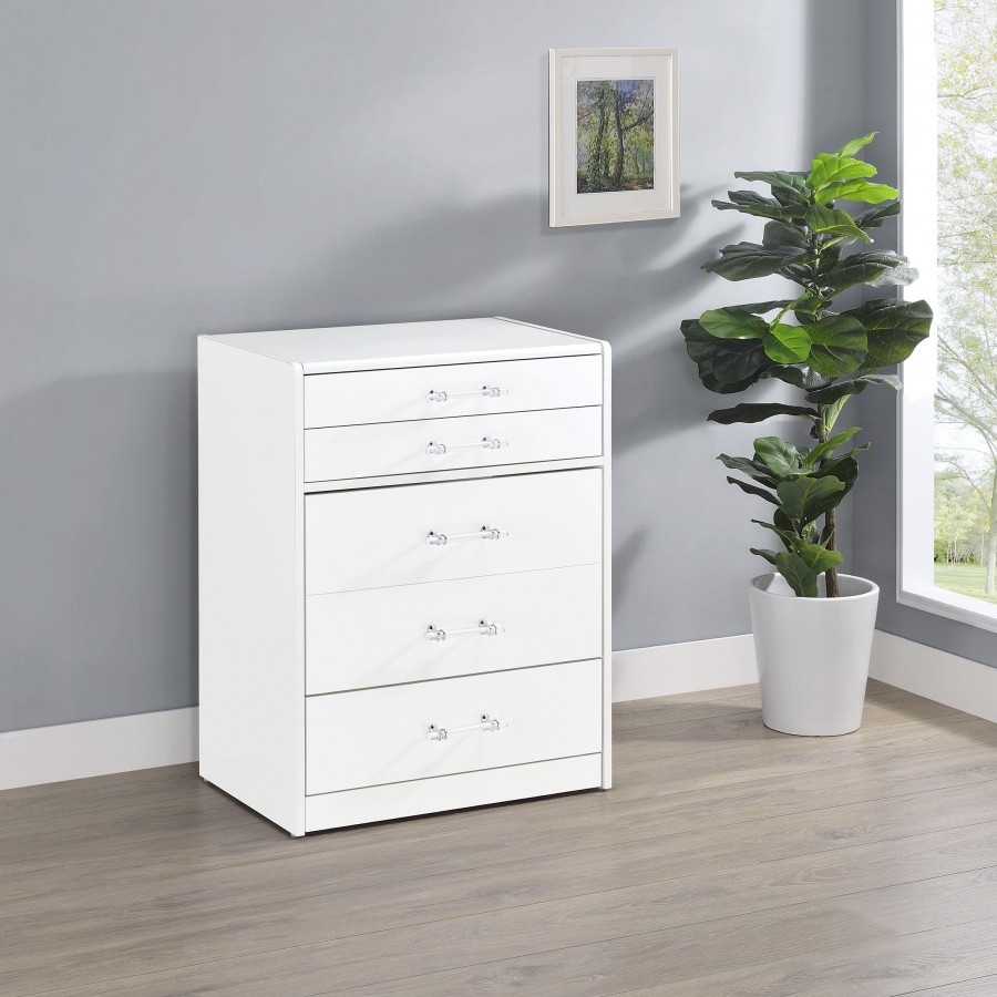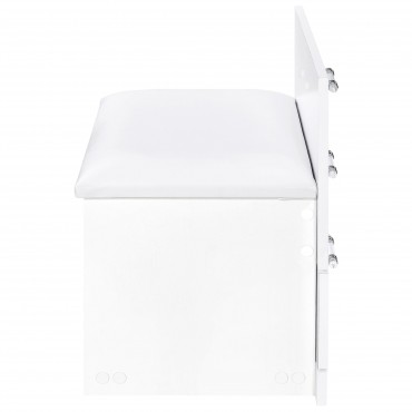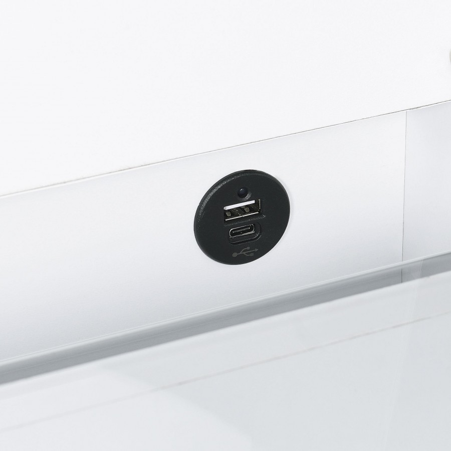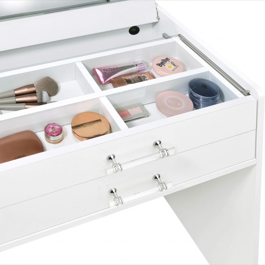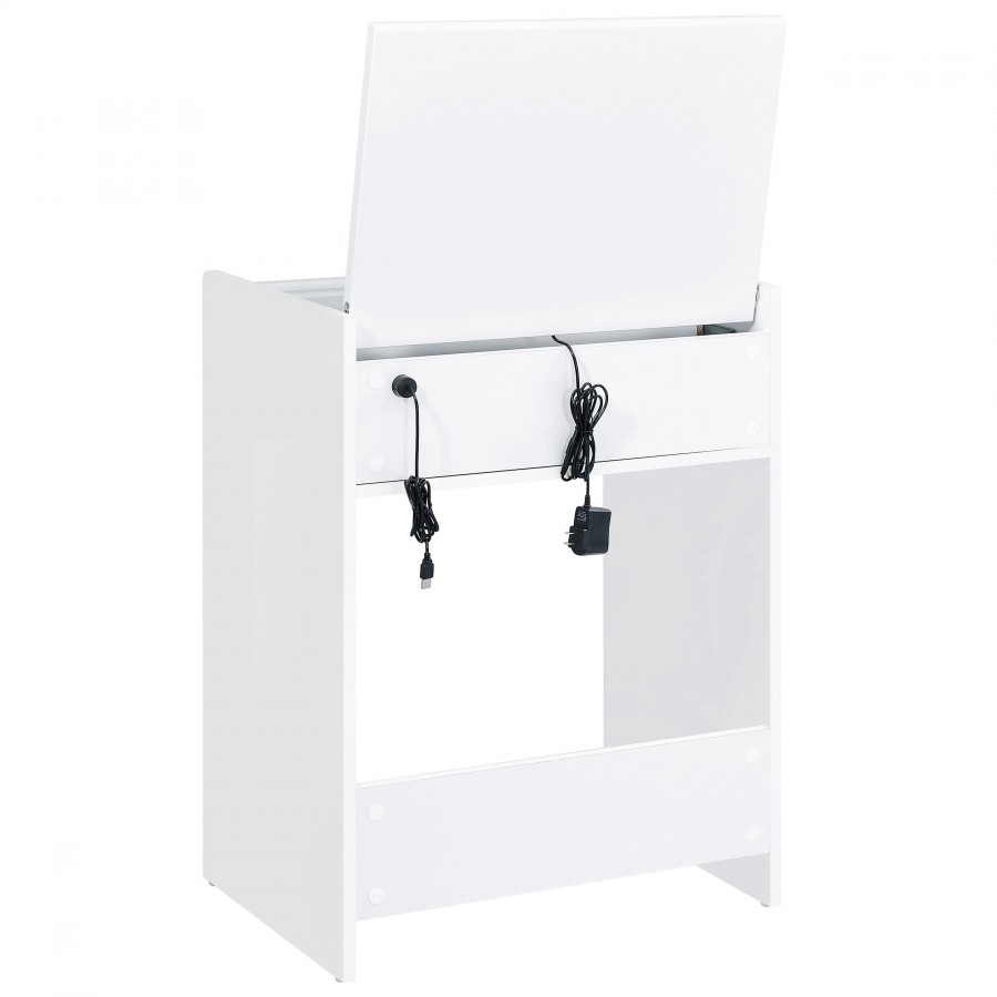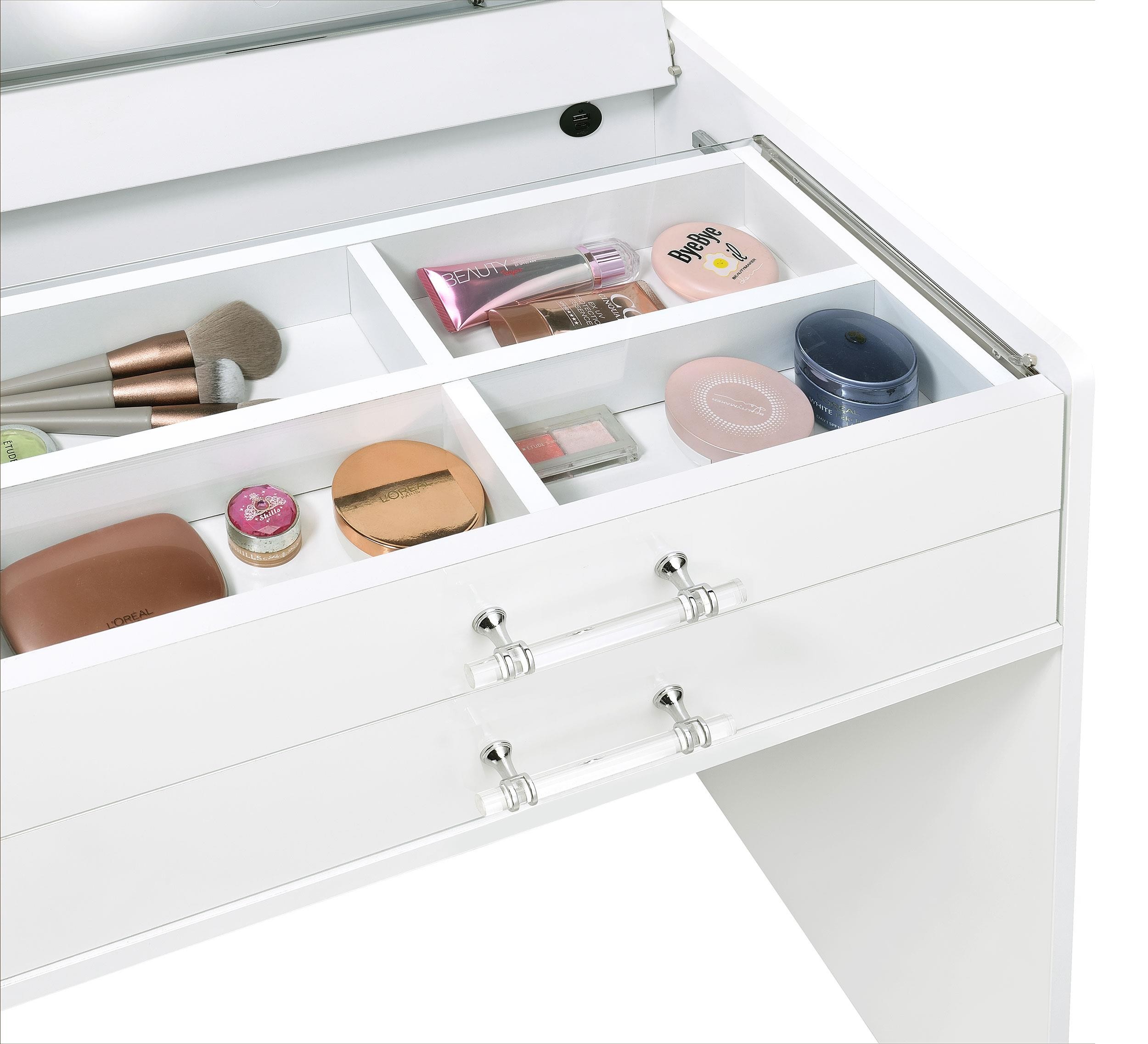 This high gloss makeup vanity set, crafted from engineered wood with eco-friendly laminate, blends seamlessly into your bedroom, doubling as a chic chest of drawers. The flip-top vanity mirror with LED lighting offers perfect illumination, while built-in dual USB outlets (Type A and Type C) allow for convenient device charging. The clear glass tabletop reveals a compartmentalized drawer for easy organization, and the cushioned vanity chair includes extra storage. Clear acrylic and chrome pull handles add a modern, elegant touch.