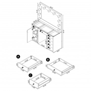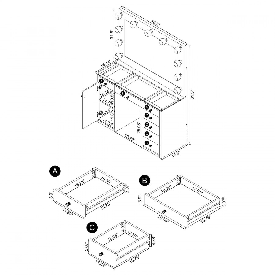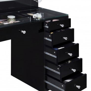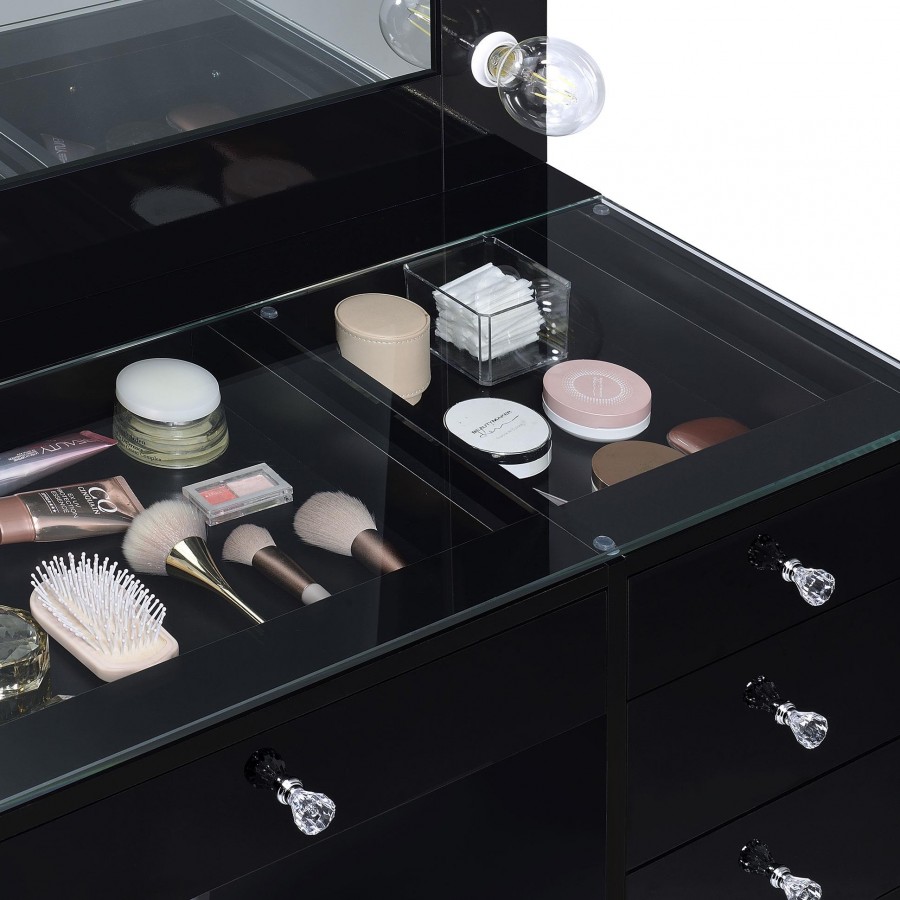 Create space for all your makeup, skincare and hair needs with this contemporary lighted vanity table and mirror. A sleek, fresh look, it boasts a glass top that allows you to see items placed in top drawers. Seven drawers total create easy opportunity for organization of all your products. A cabinet adds adjustable shelving for larger items. The mirror is lighted on three sides, offering multi-directional illumination for even lighting as you apply makeup or fix your hair.