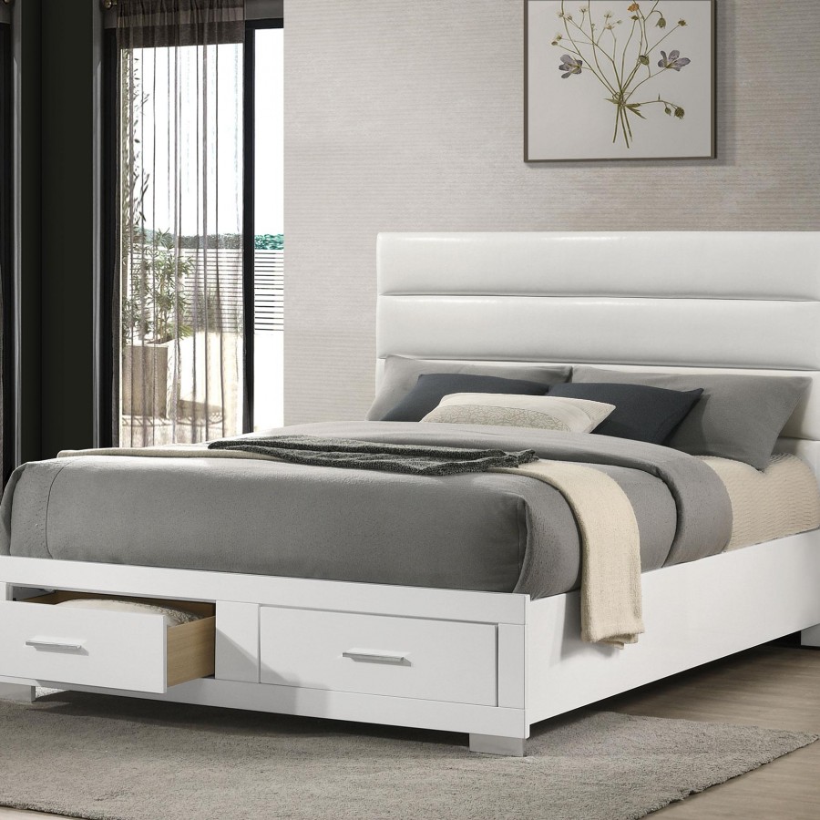 This platform bed blends modern design with practical functionality. The frame is crafted from solid hardwood and engineered wood for lasting durability, while the channel-tufted headboard features foam padding and white faux leather upholstery for a plush feel. A white high-gloss finish enhances the bed’s sleek look. Two storage drawers offer convenient organization, and the platform base combines slats and panels to ensure even weight distribution for reliable mattress support.