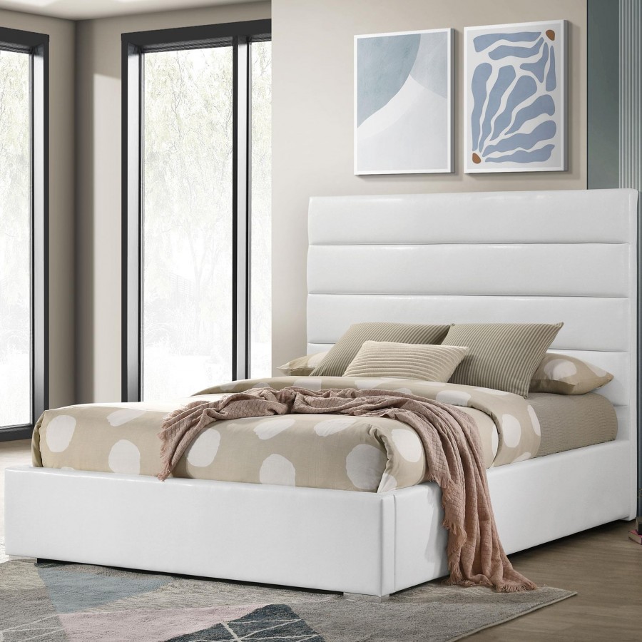 Elevate your bedroom with this modern upholstered bed featuring clean lines and a minimalist design. Wrapped in white faux leather, the panel headboard showcases horizontal channeling for a sleek and contemporary look. The sturdy frame includes slat support, eliminating the need for a box spring while ensuring mattress stability. Crafted from durable materials, this bed combines engineered wood and metal for lasting reliability. Perfect for creating a crisp, modern ambiance in any bedroom.