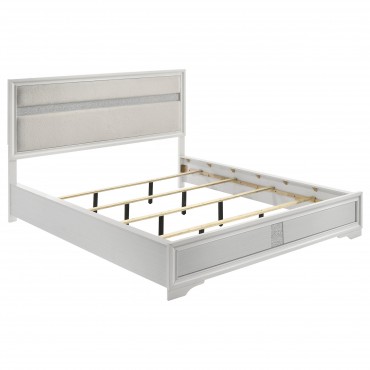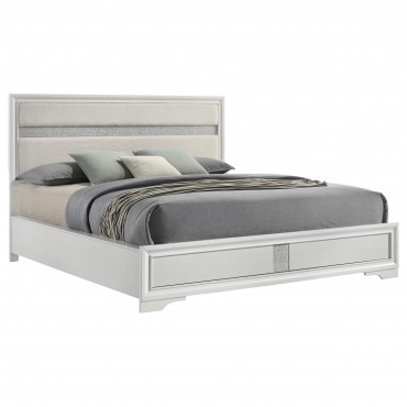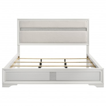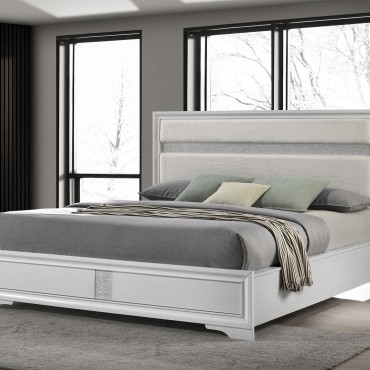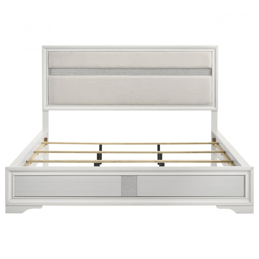 Introduce a little bit of glam flair to your bedroom with a modern upholstered bed. Featuring padded white fabric panels, the headboard is complete with molded trim and a horizontal stripe that glitters in the light. A matching vertical stripe on the low footboard is the perfect complement. A white finish is lightly textured on the panel footboard and rails, while trim is smooth and cool. The bed is complete with slats and center legs for added support and requires a foundation.