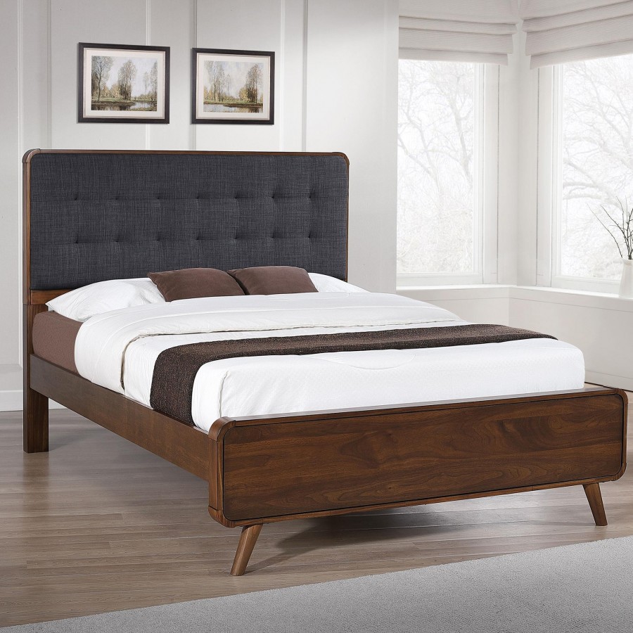 Bring countryside charm to your bedroom with this mid-century-inspired bed, expertly crafted from pine, engineered wood, and walnut veneer for durability and style. The upholstered headboard features thick padding and square tufting for a touch of elegance and comfort, while the sleek, low-profile footboard completes the refined silhouette. Rounded corners and tapered legs highlight the retro-modern design, and its elevated frame adds a clean, airy look. Perfect for creating a serene and stylish bedroom retreat.