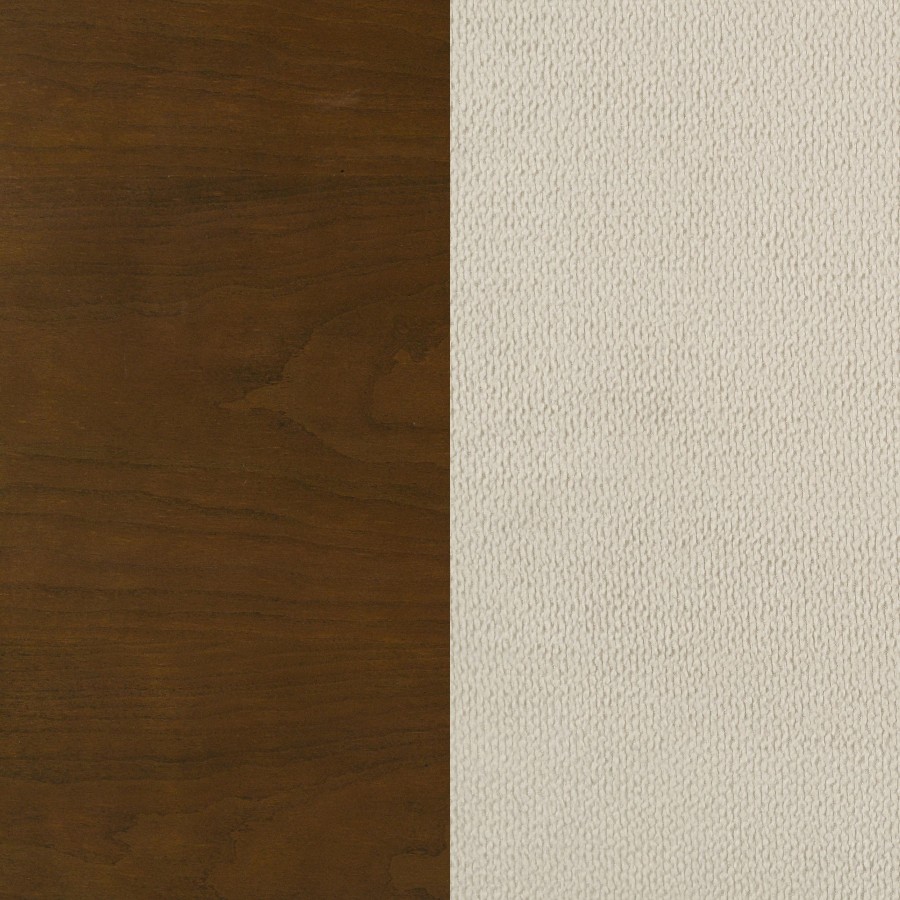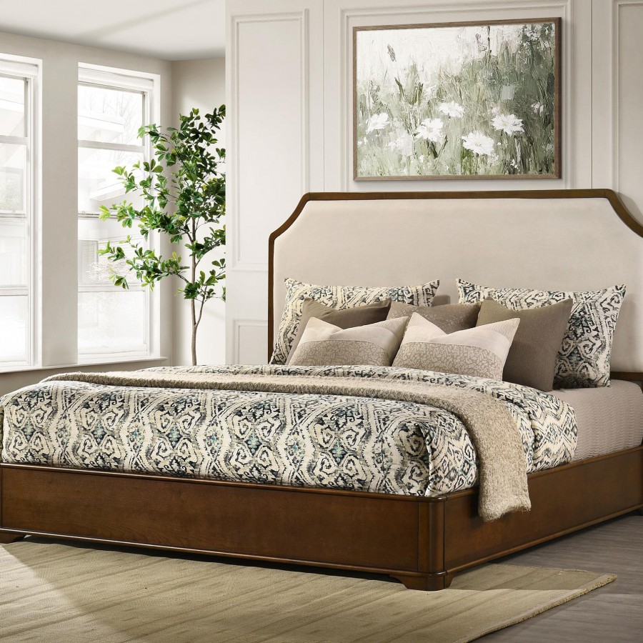 This panel bed reimagines classic Louis Philippe elegance with softened curves and graceful symmetry. Wrapped in cream fabric, the upholstered headboard is framed with cutaway corners and sculpted rails, creating a romantic focal point. A warm brown cherry finish enriches the frame with traditional depth and charm. Expertly crafted from solid rubberwood, cherry veneer, and padded fabric, it offers lasting beauty and serene comfort.