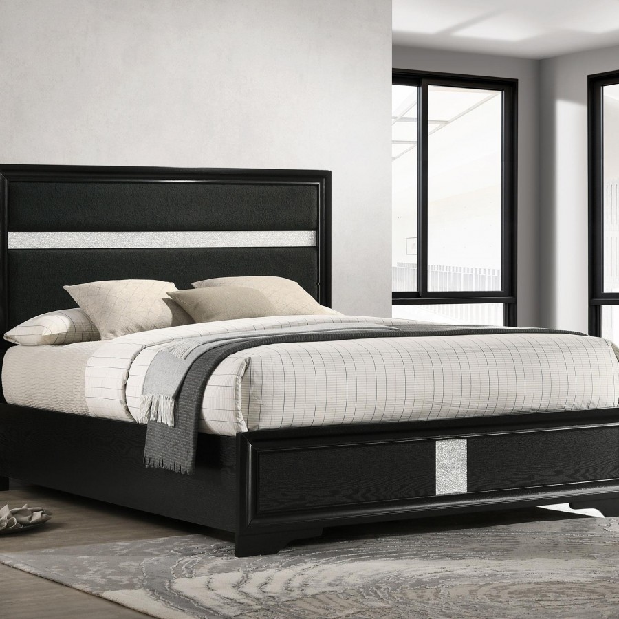 Embrace tuxedo style with the dramatic black and sparkling trim featured on a modern wooden bed. Its simple silhouette brings elegant presence with a rectangular headboard complete with upholstered panels, foam cushioning and black fabric. Glittering trim adds sparkle and elegance in a horizontal stripe on the headboard and vertical stripe on the footboard. The footboard adds a low profile, clean-lined touch, perfect for an open, airy bedroom. Thick side rails and bracket feet complete the bed to perfection.