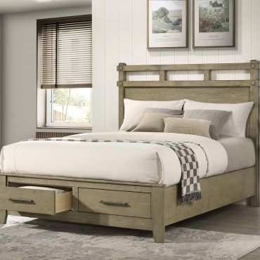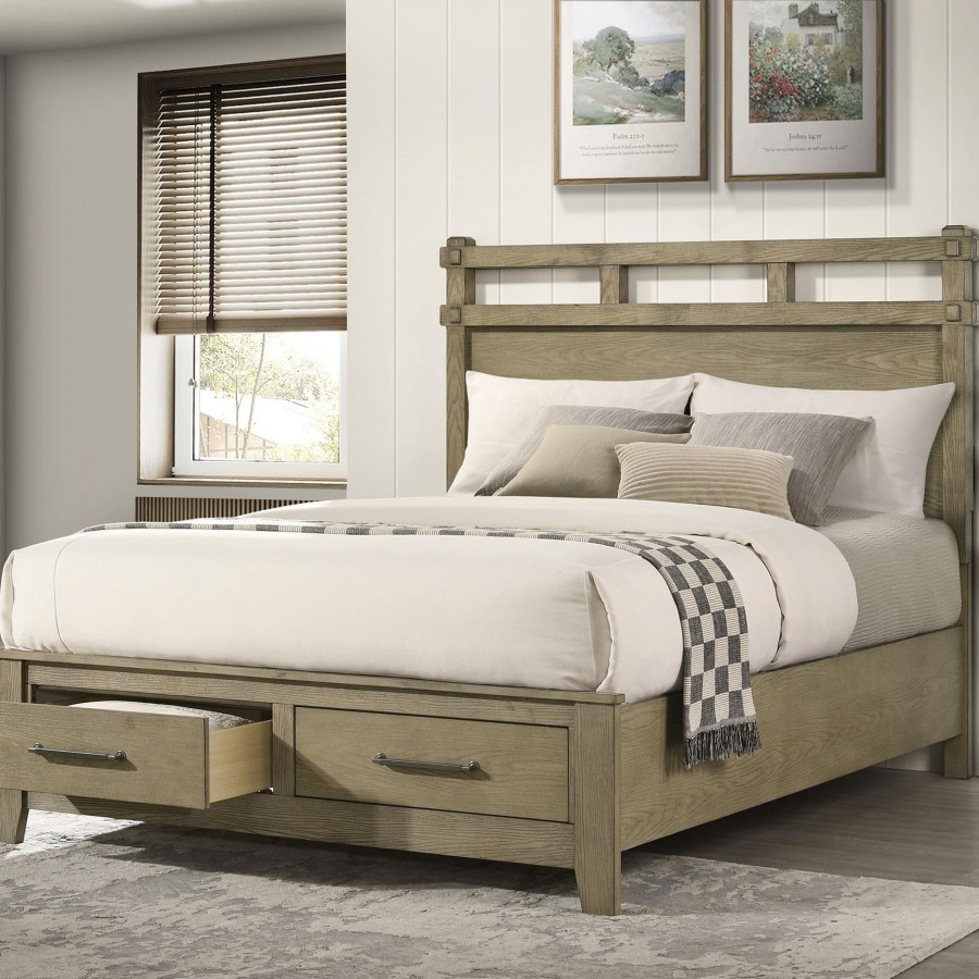 This platform storage bed blends graceful simplicity with practical function. A vineyard oak finish highlights the embossed oak grain across rubberwood and engineered wood veneer. The headboard features framed platforming with open slat detail for added visual lightness. Two footboard drawers provide concealed storage, supported by durable center metal glides. A warm transitional style, this bed balances everyday utility with natural wood textures and quiet charm.