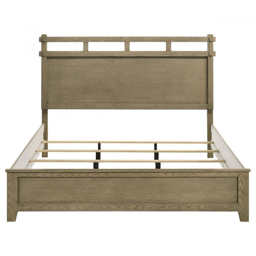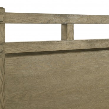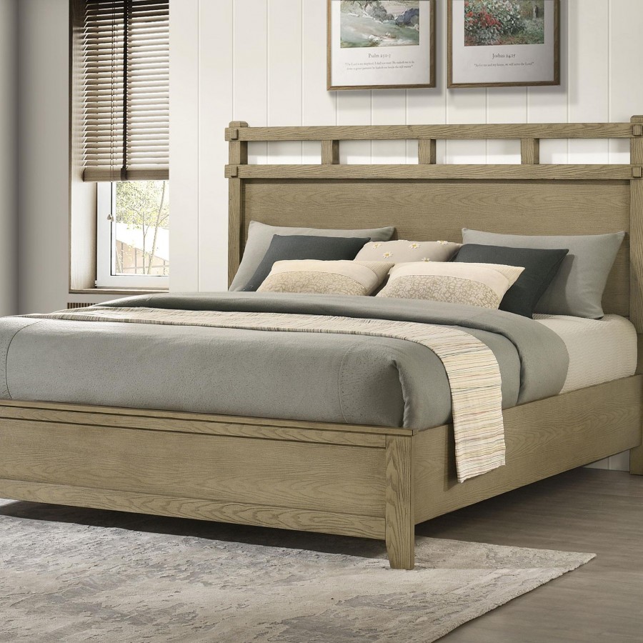 Blending clean lines with warm character, this panel bed delivers timeless style for transitional spaces. Crafted from rubberwood with engineered wood veneer embossed in an oak grain texture, its frame showcases a refined vineyard oak finish. A distinctive open-slat headboard design adds depth and craftsmanship to the silhouette. Designed for use with a foundation, this bed is a sturdy and stylish centerpiece for the modern bedroom.