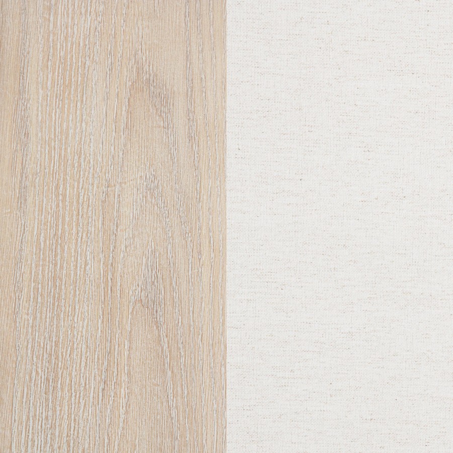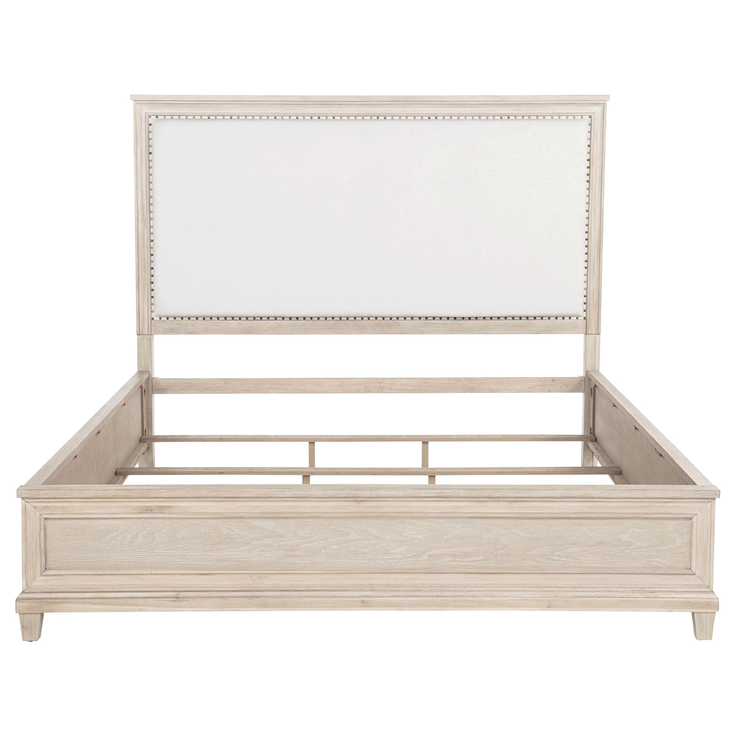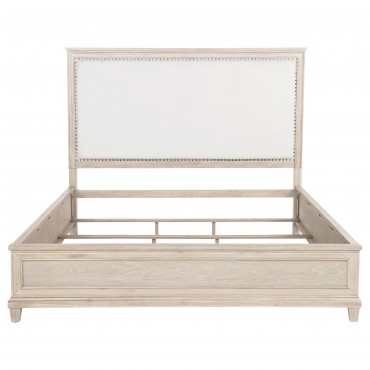 A quiet invitation to rest, this panel bed evokes the calm of coastal mornings and the grace of timeless design. Its tall headboard, wrapped in creamy fabric and framed by washed oak, offers a gentle contrast of texture and tone. A delicate row of nailhead trim glimmers like a finishing touch, while raised panel detailing at the footboard adds poised refinement. Crafted with care from oak veneer, poplar, and soft upholstery, this bed brings serenity and structure to the heart of the bedroom.