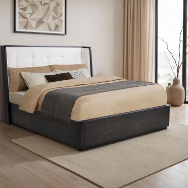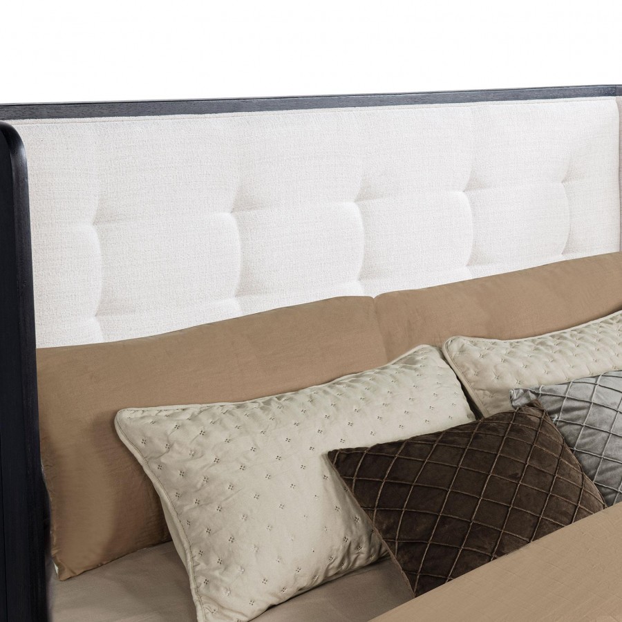 Embrace restful refinement with this wingback bed, where sculpted edges and tailored softness unite. The headboard’s clean winged silhouette is wrapped in cream fabric, offering contrast against the burnished black frame and subtle tufting for a gentle finish. Crafted from a blend of solid and engineered wood, this foundation-ready bed balances strength with serenity, blending modern minimalism with quiet luxury.