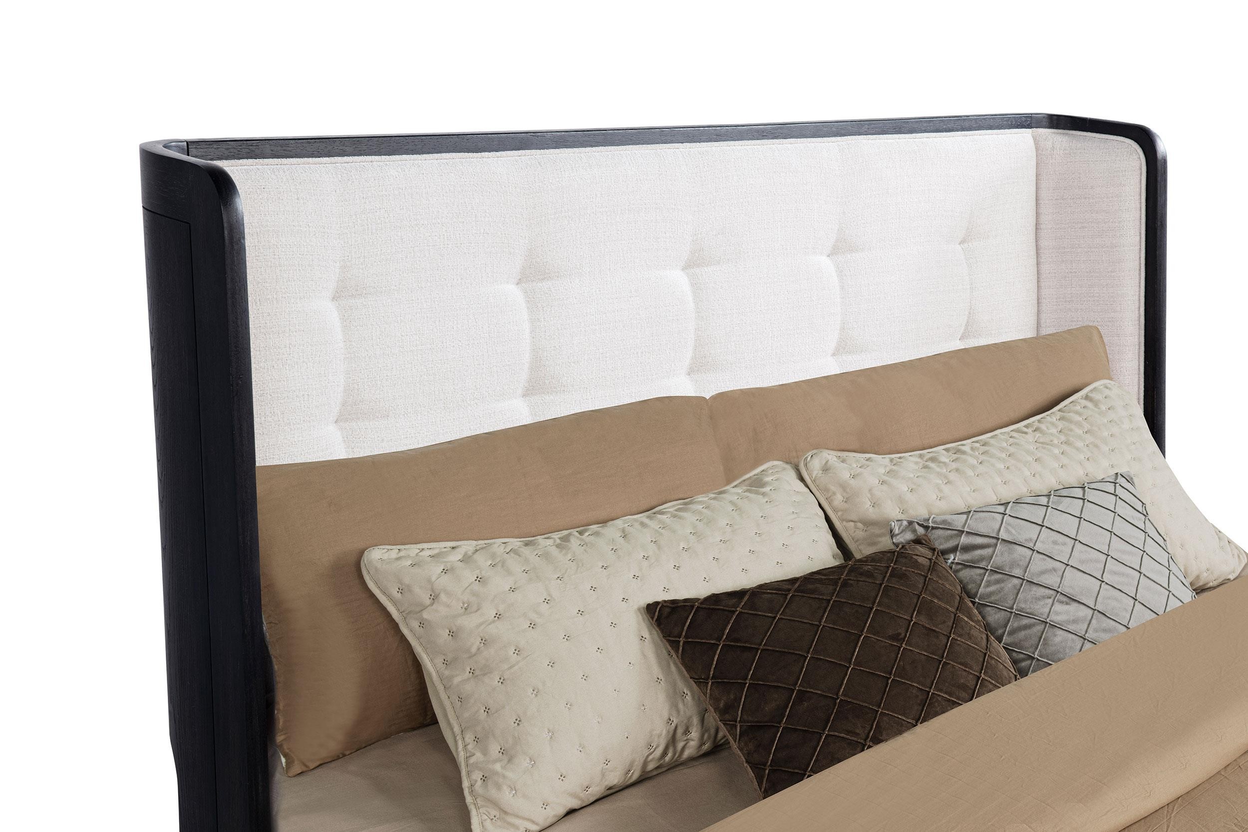 Embrace restful refinement with this wingback bed, where sculpted edges and tailored softness unite. The headboard’s clean winged silhouette is wrapped in cream fabric, offering contrast against the burnished black frame and subtle tufting for a gentle finish. Crafted from a blend of solid and engineered wood, this foundation-ready bed balances strength with serenity, blending modern minimalism with quiet luxury.