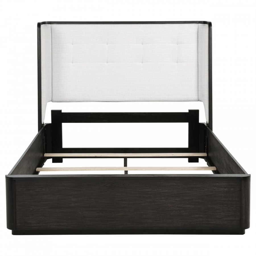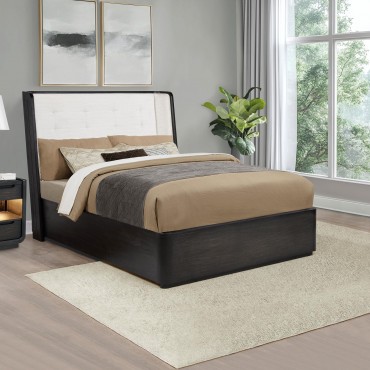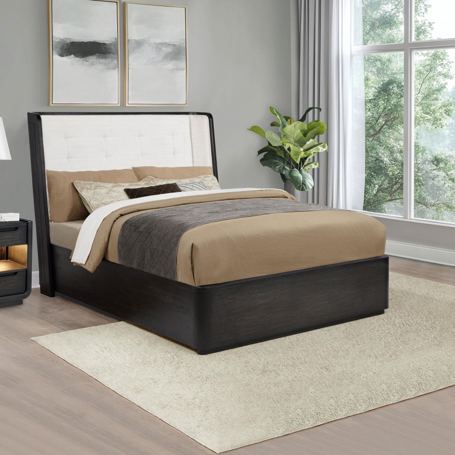 Embrace restful refinement with this wingback bed, where sculpted edges and tailored softness unite. The headboard’s clean winged silhouette is wrapped in cream fabric, offering contrast against the burnished black frame and subtle tufting for a gentle finish. Crafted from a blend of solid and engineered wood, this foundation-ready bed balances strength with serenity, blending modern minimalism with quiet luxury.