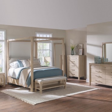 Airy and architectural, this canopy bed brings sculptural presence and soft romance to the bedroom. Gracefully arched posts frame a tall silhouette, while an upholstered headboard adds a tailored layer of texture and comfort. Designed with a platform panel base, it offers lasting support without the need for a foundation. Crafted from mahogany, engineered wood, mango veneer, and fabric, this piece blends strength and serenity in perfect harmony.