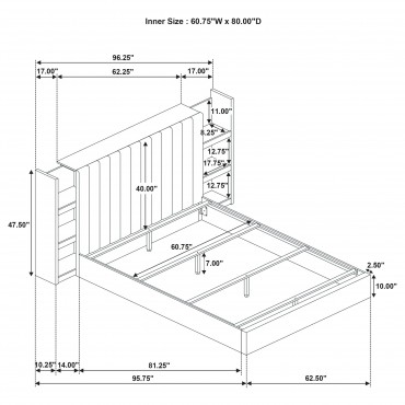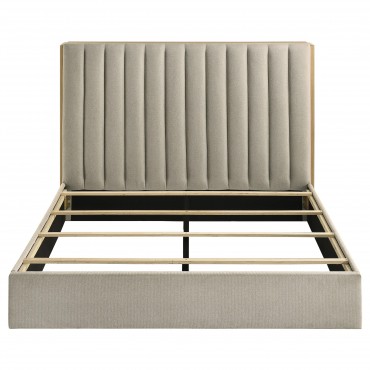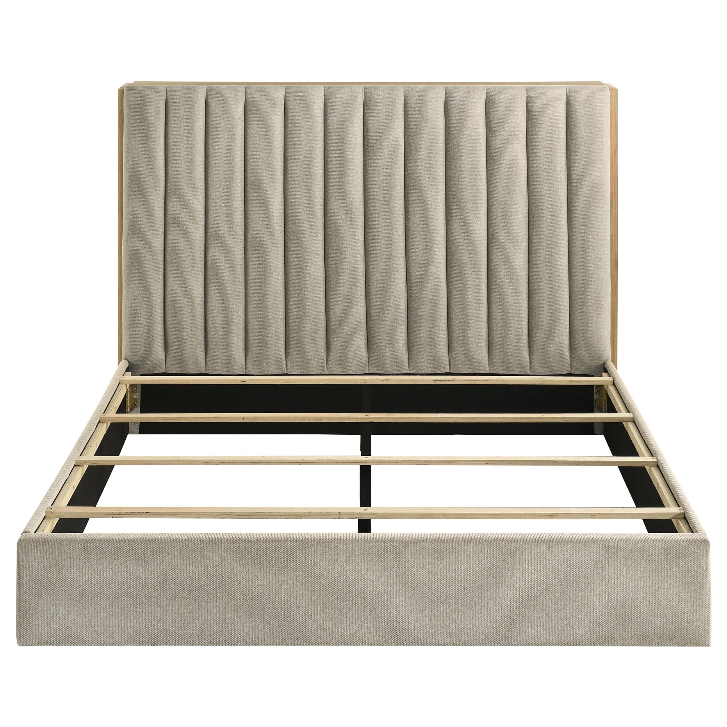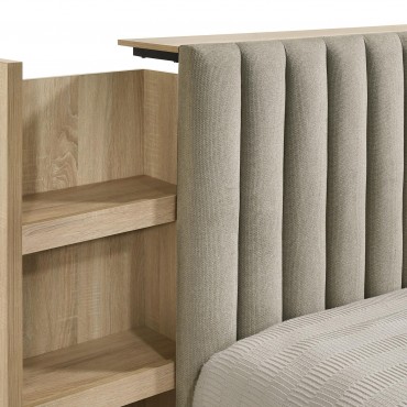 A striking balance of softness and ingenuity, this storage bed is a true centerpiece. A plush, vertical channel-tufted headboard is embraced by light oak bookcase panels, each with three open shelves that glide outward on hidden casters. Wrapped in textured fabric and built with engineered wood and a durable laminate veneer, the supportive platform base offers comfort and stability with a touch of modern grace.