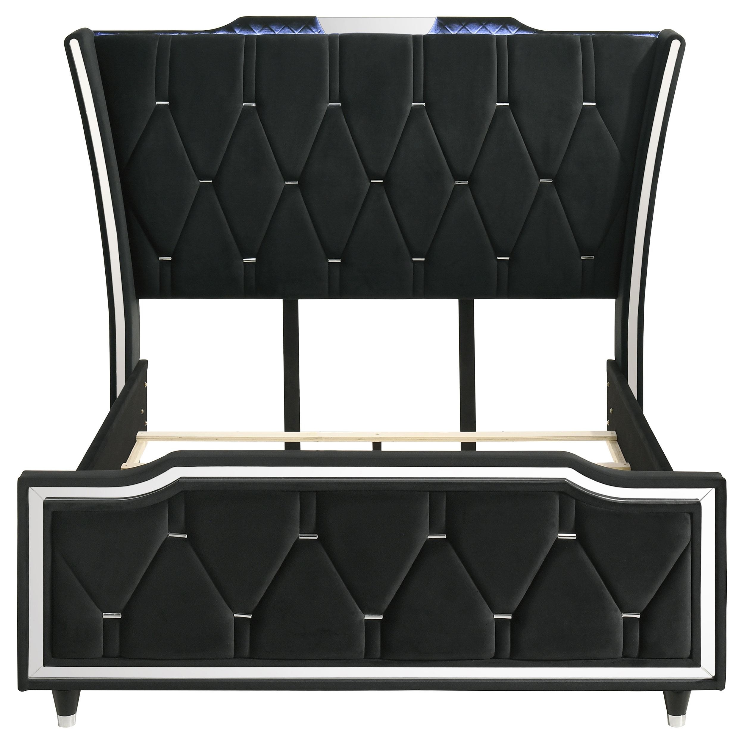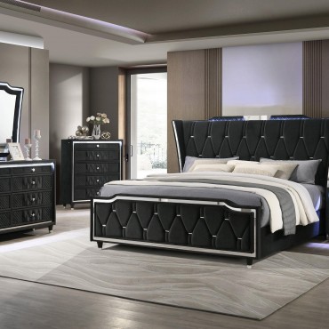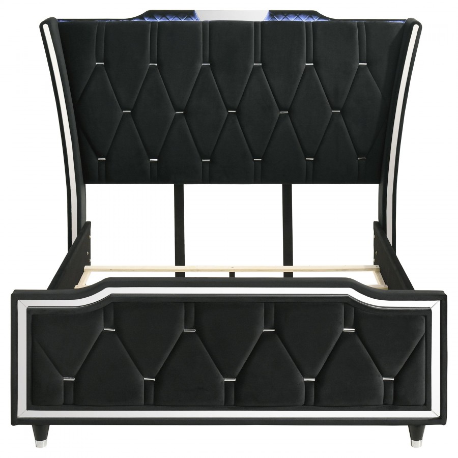 Indulge in soft glamour with this wingback bed, richly upholstered in a luxurious black velvet. A tall, button-tufted headboard curves outward with sculptural wings and a built-in LED crown accent for ambient glow. The padded footboard echoes the headboard’s tufted detail and rests on solid rubberwood legs for a touch of airy elegance. Crafted from solid and engineered wood, this foundation-ready frame is a statement in luxury and comfort.