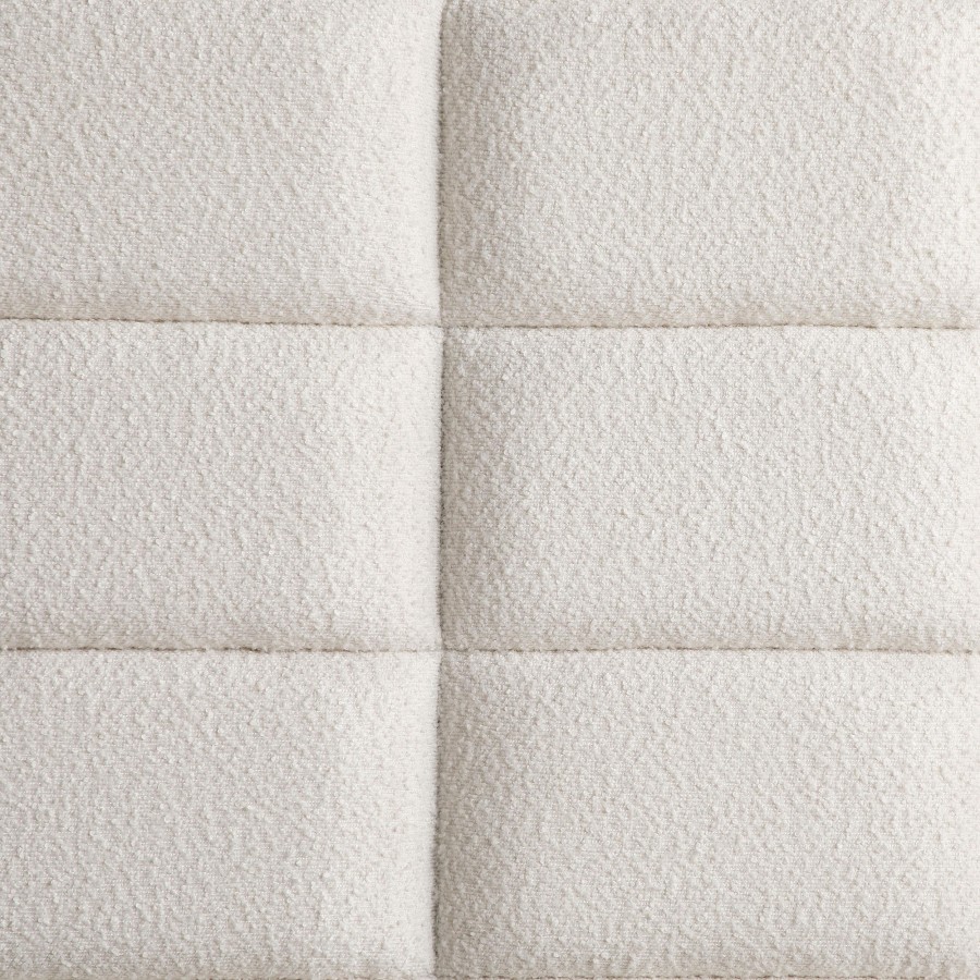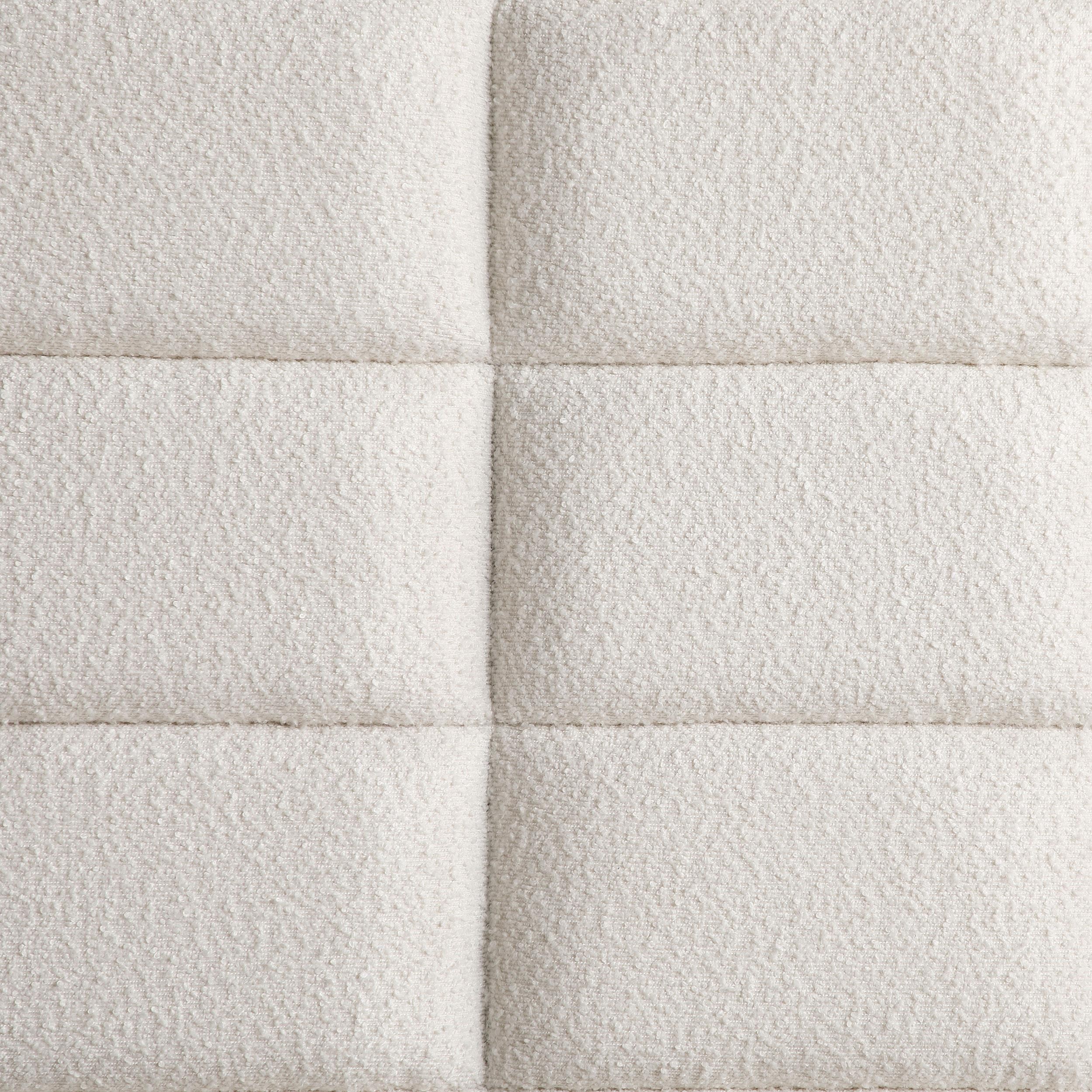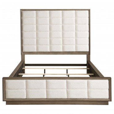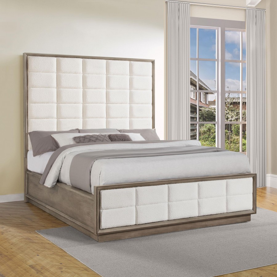 Elevate an inviting master or guest bedroom with the refined flair of this modern upholstered bed. It boasts a wooden frame in a taupe oak finish, creating a neutral palette. Cream upholstery is grid tufting, adding to the architectural appeal of this charming bed. The extra-tall headboard is paired with a low footboard, establishing an open, airy presentation in your bedroom. You'll love lounging against its foam cushioning and relaxing in comfort.