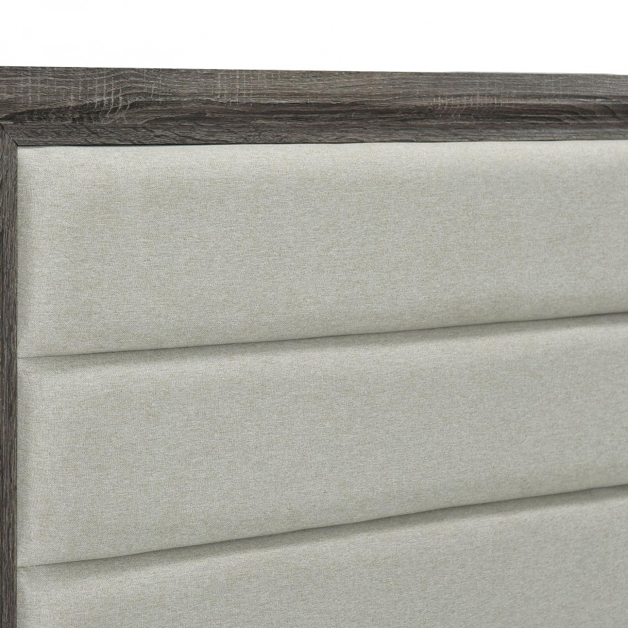Introduce refined style in an approachable bedroom ensemble with this transitional wooden bed. With an upholstered headboard, it delivers impeccable comfort for lounging and relaxation. A brown oak wood grain finish pairs with laminate, delivering the perfect blend of style and durability. Tan fabric pairs with foam cushioning, delivering a complementary color tone that remains neutral in your bedroom. The bed features a tall headboard paired with a low footboard, creating an open, airy profile.