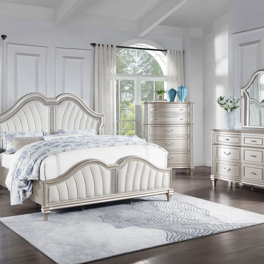 Elevate your restful bedroom retreat with this elegant, glam platform bed. A curvy double arch headboard and footboard are designed with a padded insert of flared channel tufting that lends an eye-catching motif. Each padded piece is upholstered in a soft, ivory fabric that lends a neutral color palette. A silver oak finished frame gives off a chic pearlescent look and feel, accented by glittering panels that rest flush between the crown molding and trim details throughout. Slender, tapered legs offer a subtle lift, allowing for extra storage beneath.