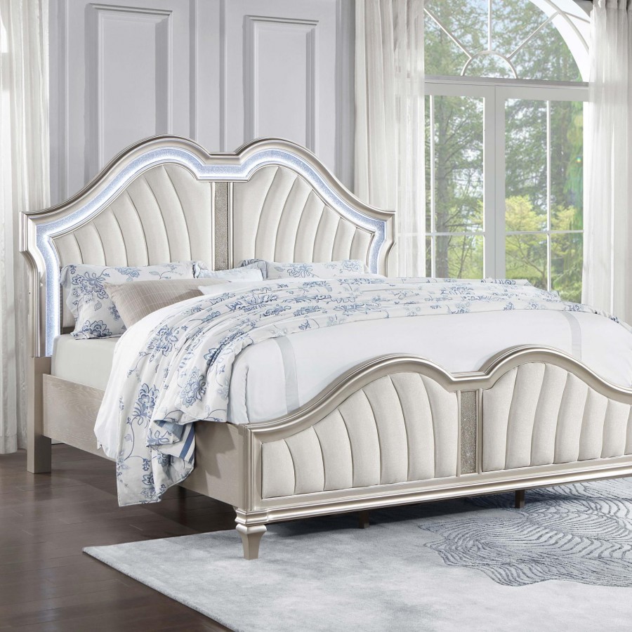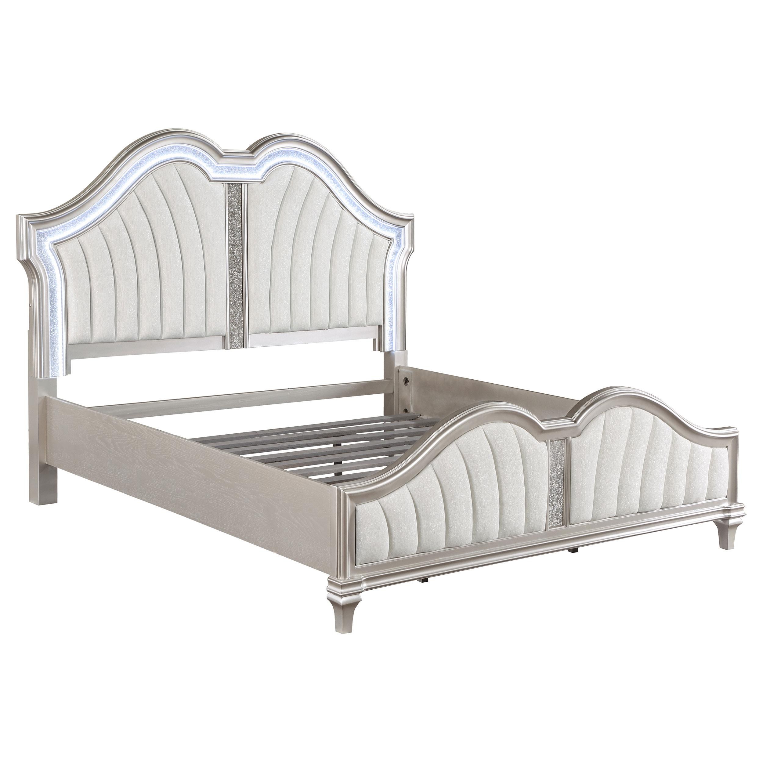 Elevate your restful bedroom retreat with this elegant, glam platform bed. A curvy double arch headboard and footboard are designed with a padded insert of flared channel tufting that lends an eye-catching motif. Each padded piece is upholstered in a soft, ivory fabric that lends a neutral color palette. A silver oak finished frame gives off a chic pearlescent look and feel, accented by glittering panels that rest flush between the crown molding and trim details throughout. Slender, tapered legs offer a subtle lift, allowing for extra storage beneath.