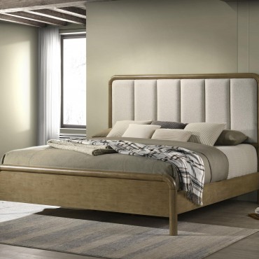 This panel bed brings a bold, modern touch to your bedroom with its clean lines and rounded corners. The warm nutmeg wood finish complements the vertical channels of the beige boucle upholstered headboard, creating a striking contrast between texture and tone. The bed's sleek design adds a contemporary flair while maintaining a minimalist profile. Crafted from solid rubberwood, this bed ensures durability and long-lasting beauty. Its frame offers a stable foundation for your mattress, providing both style and function.