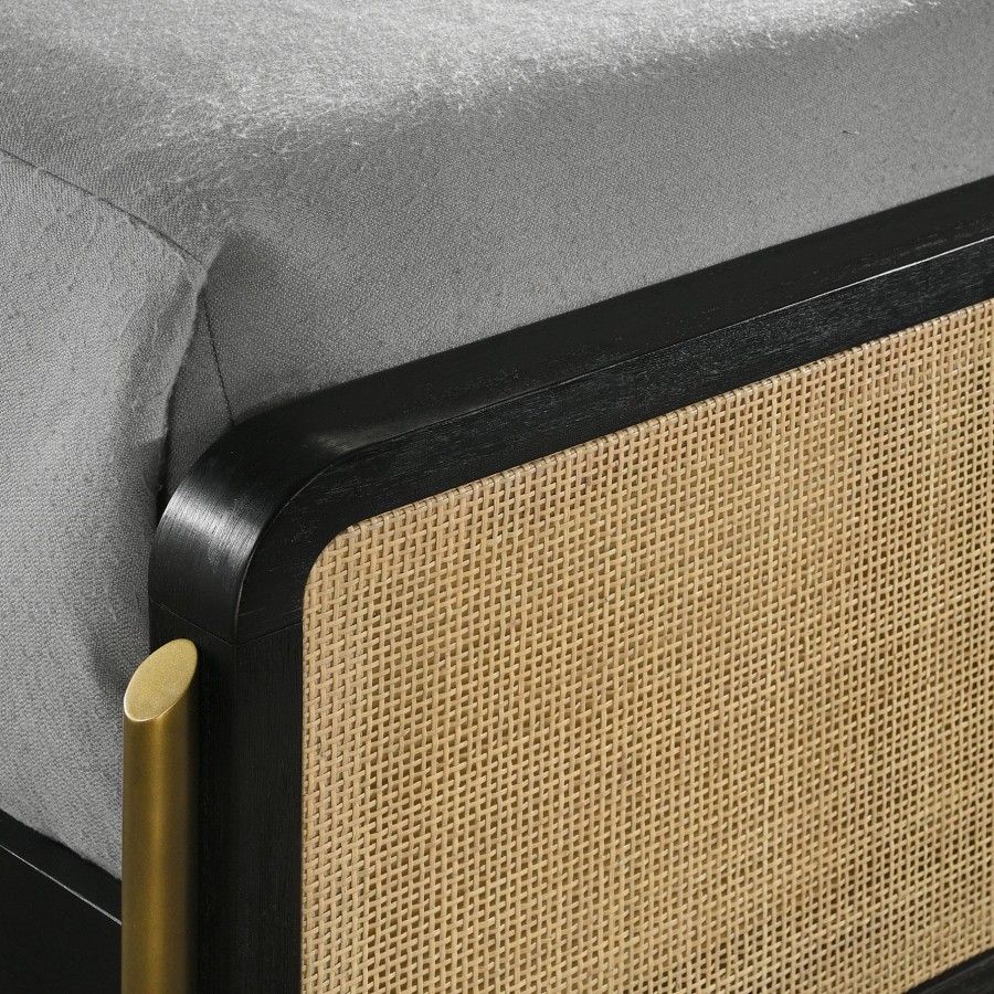 Center your bedroom on a modern coastal bed with a hint of glam flair. Its simple silhouette features a tall headboard and low footboard, each with a squared profile and rounded corners that soften the overall effect. The head and footboards feature woven rattan in a natural finish, creating a sense of both texture and warmth to complement in your modern bedroom. Slender legs feature a muted golden finish that's a perfect complement. Black finish decorates the framework and rails of the bed, creating a bold statement piece that becomes the instant centerpiece of your stylish decor.