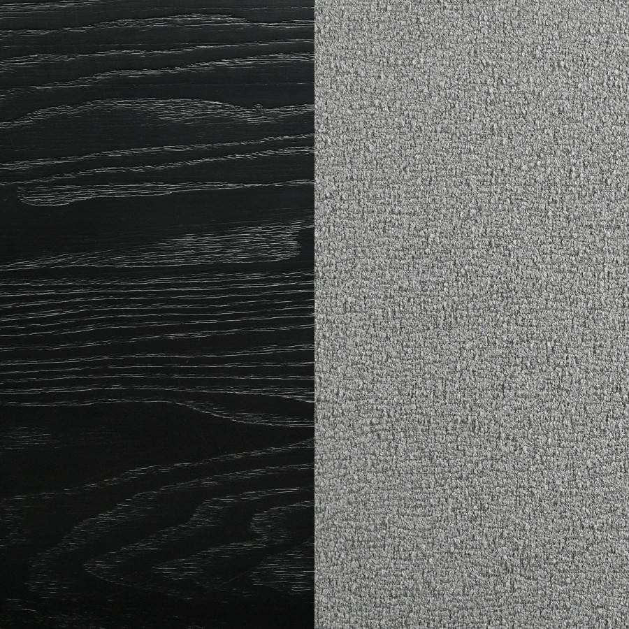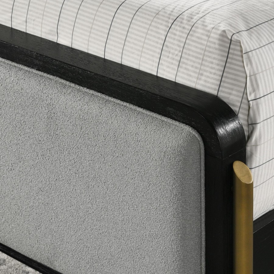 Build your sophisticated bedroom retreat space around this beautiful contemporary upholstered bed. Its understated silhouette features a tall headboard and low footboard, each with sleek rounded corners that create the perfect inviting look and feel. Upholstered panels feature stylish gray fabric with padding underneath, ensuring welcoming comfort for lounging with a book or movie. The bed features a black finish frame, and includes slats and center support legs with levelers for added structure and peace of mind. Gold finish legs add a muted touch of metallic contrast for a sophisticated touch.