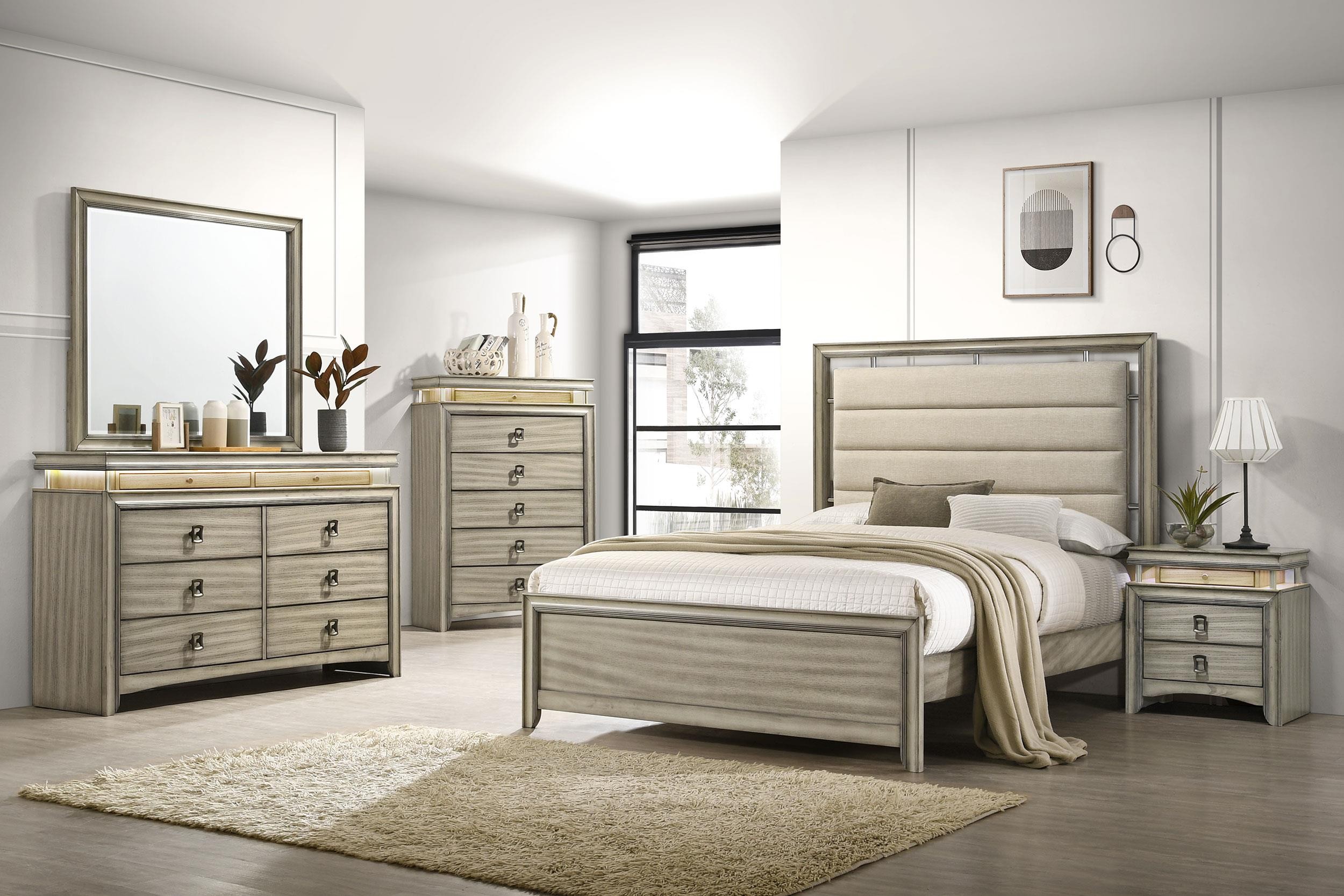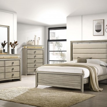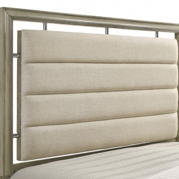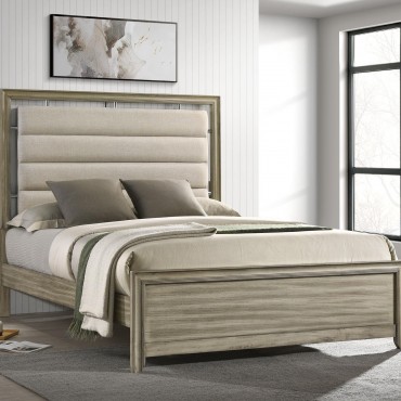 Center your inviting bedroom on a modern wooden bed. Its upholstered headboard assures welcoming indulgence, with beige fabric and channel tufting that creates comfort while lounging or relaxing. The bed is built with a wooden frame and features a rustic beige wood grain finish over its low footboard and rails. Stylish trim work adds depth the head and footboards, offering a dimensional touch in your bedroom. Pair this lovely bed with neutral linens and wood furniture for a chic but relaxed atmosphere.