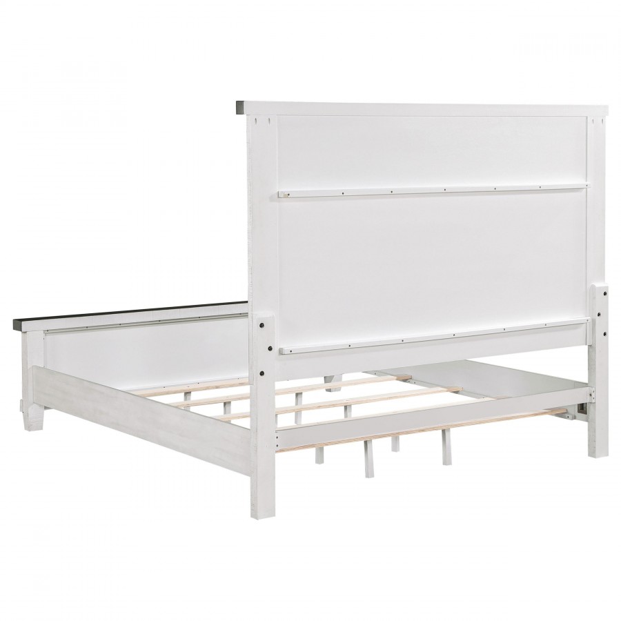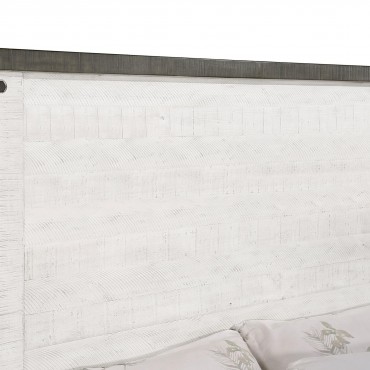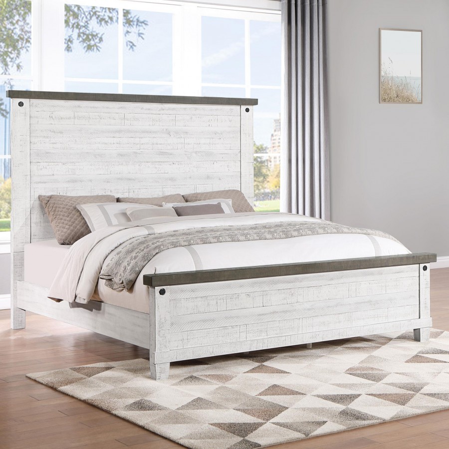 Create a peaceful bedroom retreat with the chic simplicity of a contemporary wooden bed. Clean-lined design takes center stage in the Lilith collection, offering a refined palette in distressed white and gray. Neutral enough for virtually any space, the bed features a classic squared headboard paired with a low footboard, offering a modern silhouette that's perfect for compact spaces. Dark gunmetal finish hardware punctuates the design while delivering the perfect hint of depth and contrast. Made from pine wood and veneer, this bed does require a foundation.