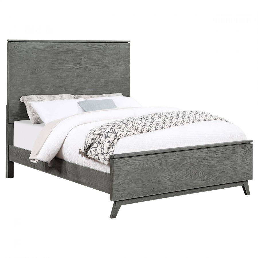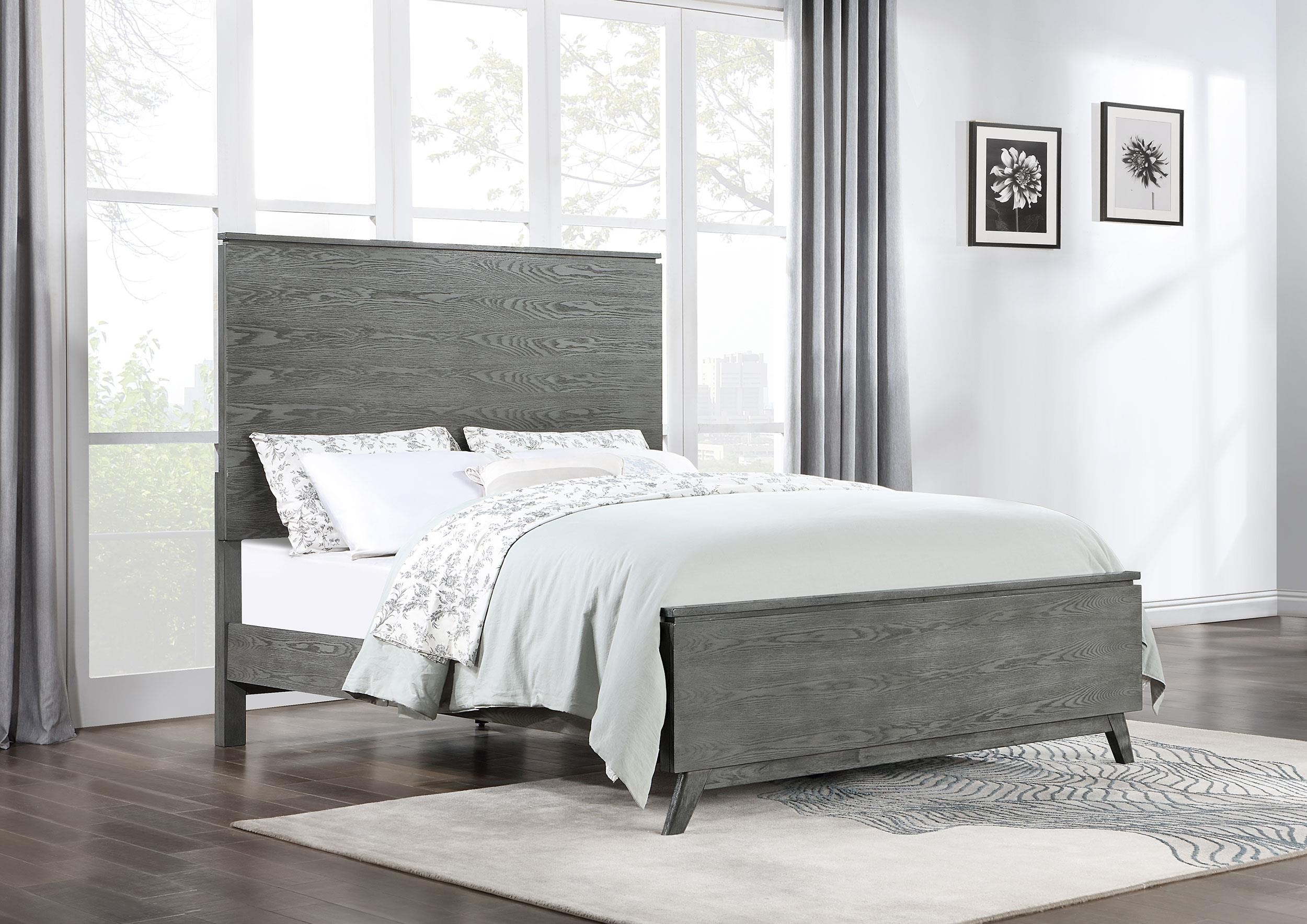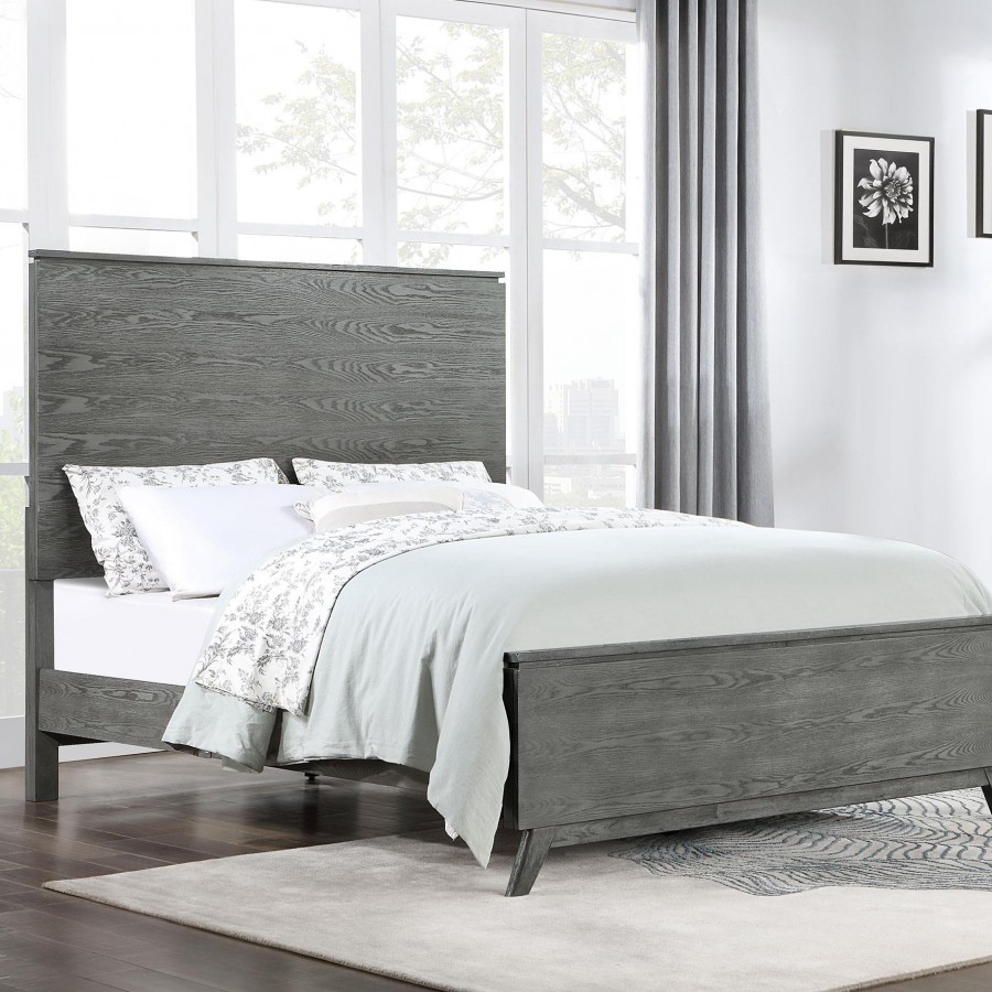 Infuse your bedroom with the soothing, earthy energy of beautiful wood with this modern bed. A soft gray finish lends contemporary flair and highlights the gorgeous grain details of oak veneer and rubberwood construction. The bed boasts a tall, square headboard, delivering impressive support and understated style in a master or guest suite. A low profile footboard reinforces its modern silhouette, while flared legs are a perfect hint of character. This bed does require a foundation for use.