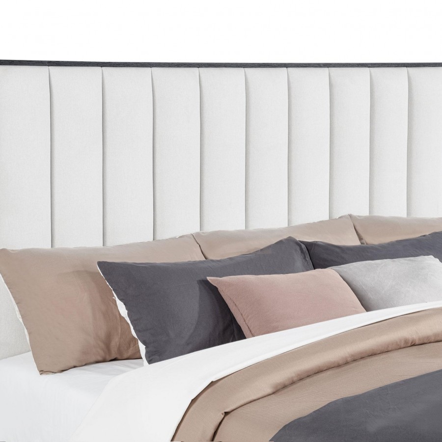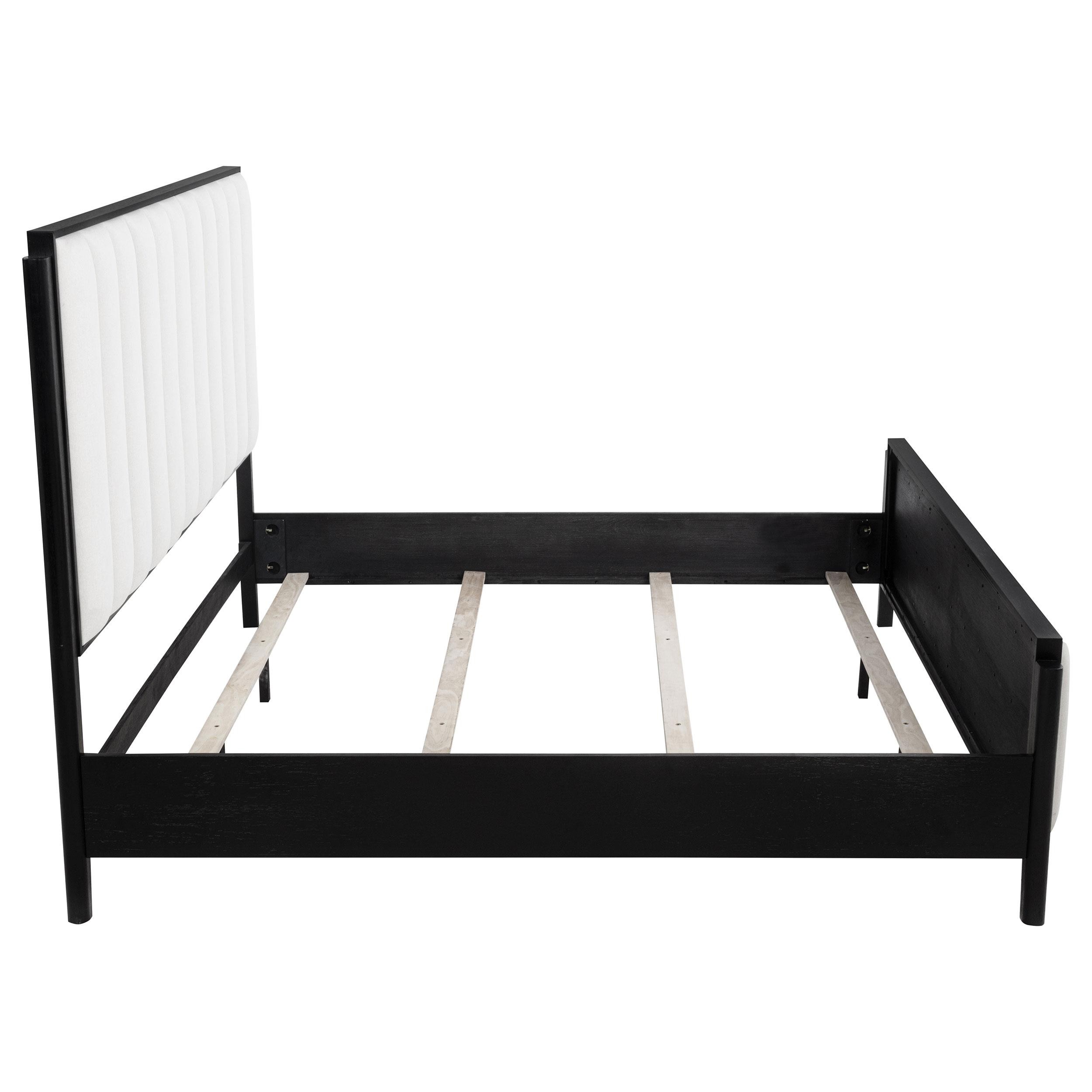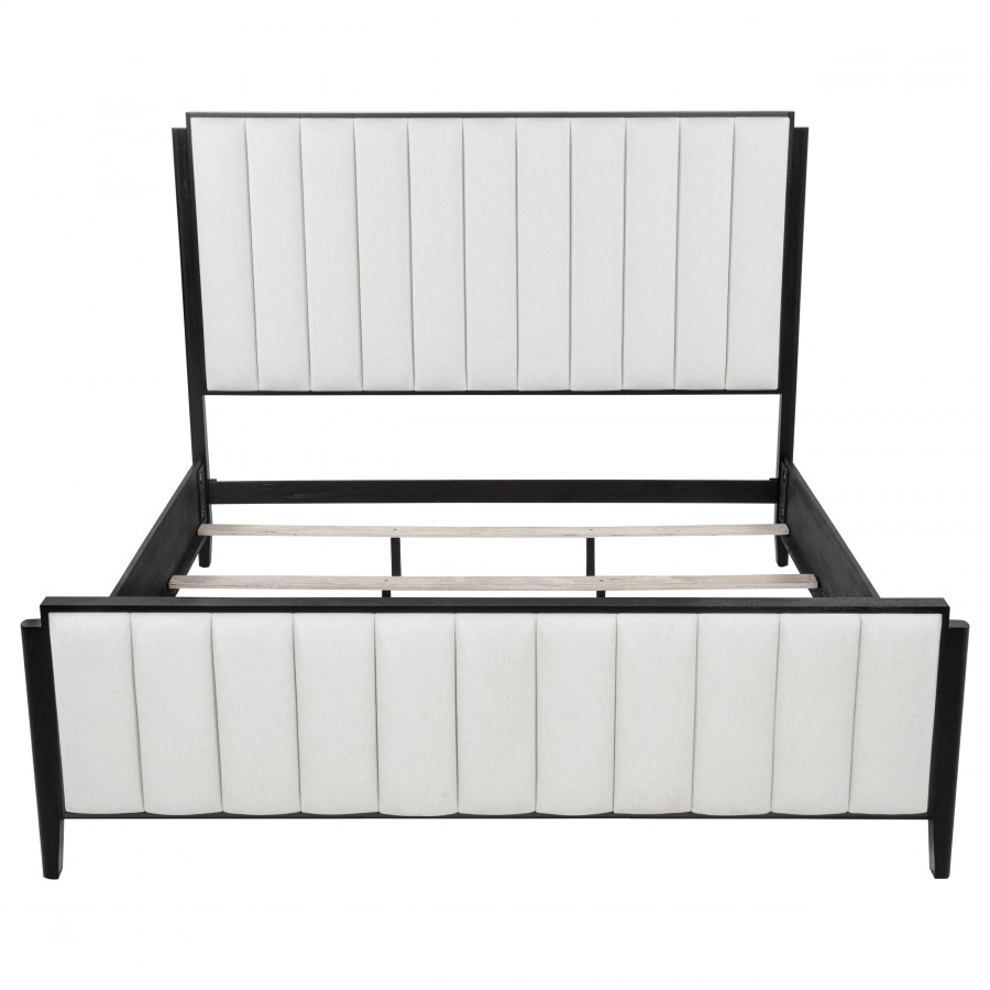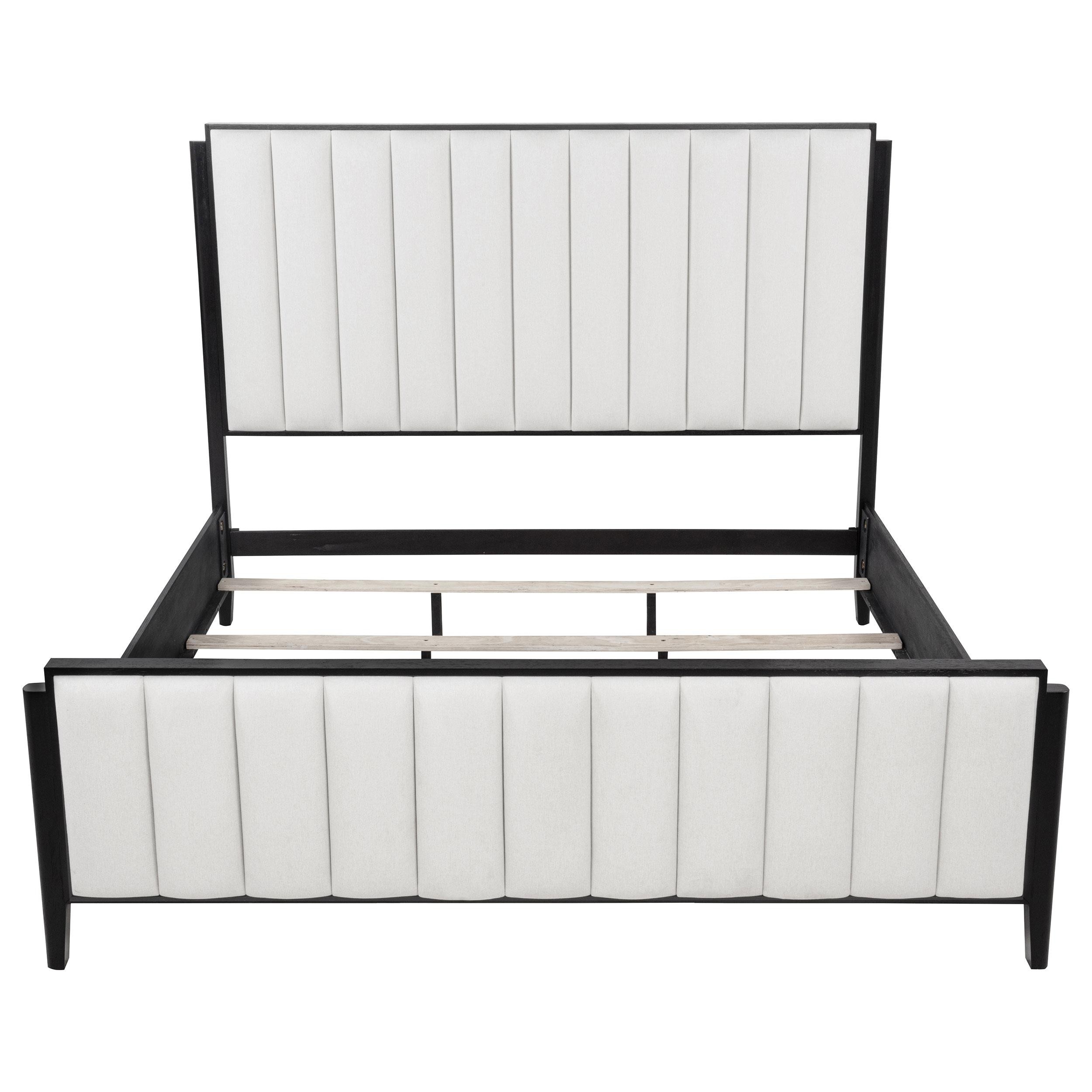 You're going to love the understated character and plush comfort of a modern wooden bed. Designed for refined flair in your bedroom, it boasts a tall headboard and low footboard. Each is accentuated with ivory upholstery over foam cushioning, with vertical channel tufting that creates texture and dimension. A black wood grain finish adds organic flair and beautiful contrast. Tapered legs complete the look of this chic bed.