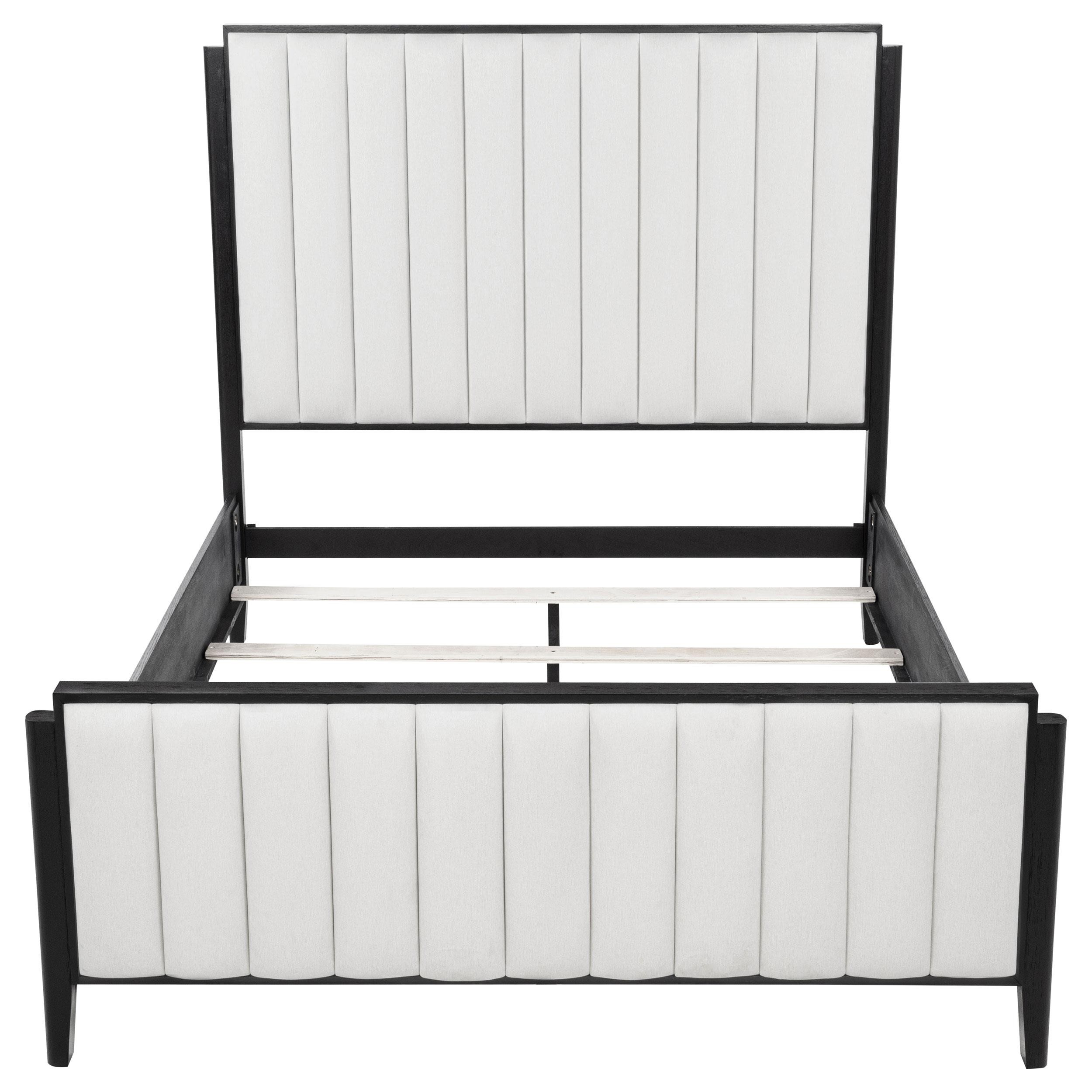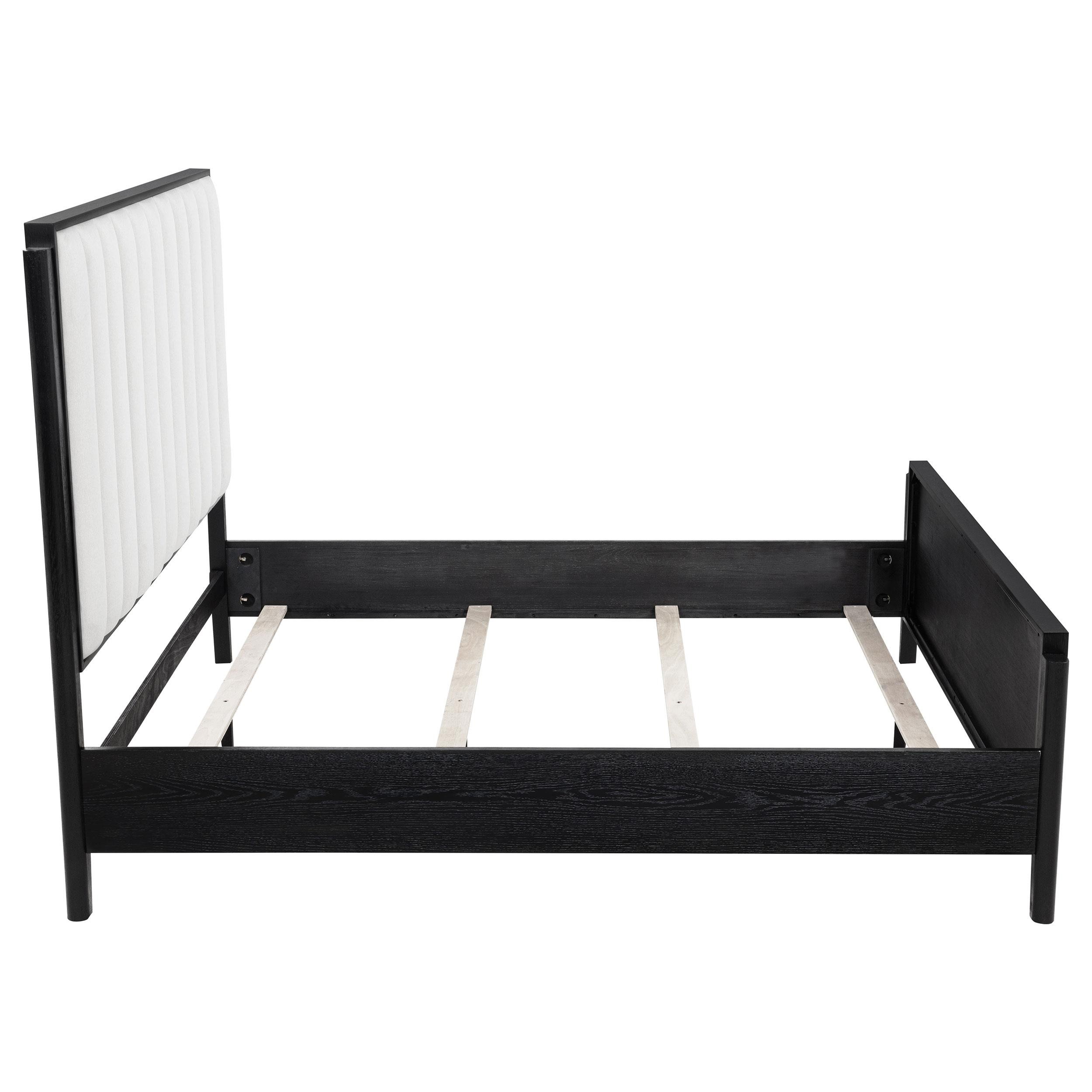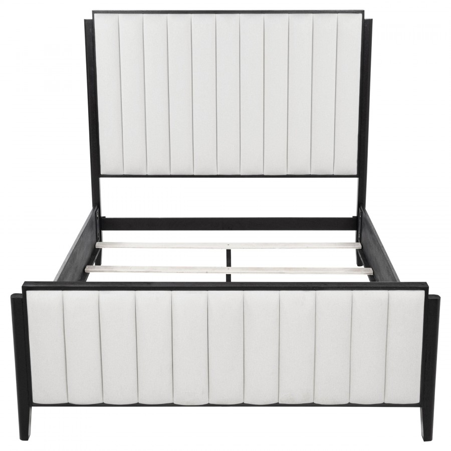 You're going to love the understated character and plush comfort of a modern wooden bed. Designed for refined flair in your bedroom, it boasts a tall headboard and low footboard. Each is accentuated with ivory upholstery over foam cushioning, with vertical channel tufting that creates texture and dimension. A black wood grain finish adds organic flair and beautiful contrast. Tapered legs complete the look of this chic bed.