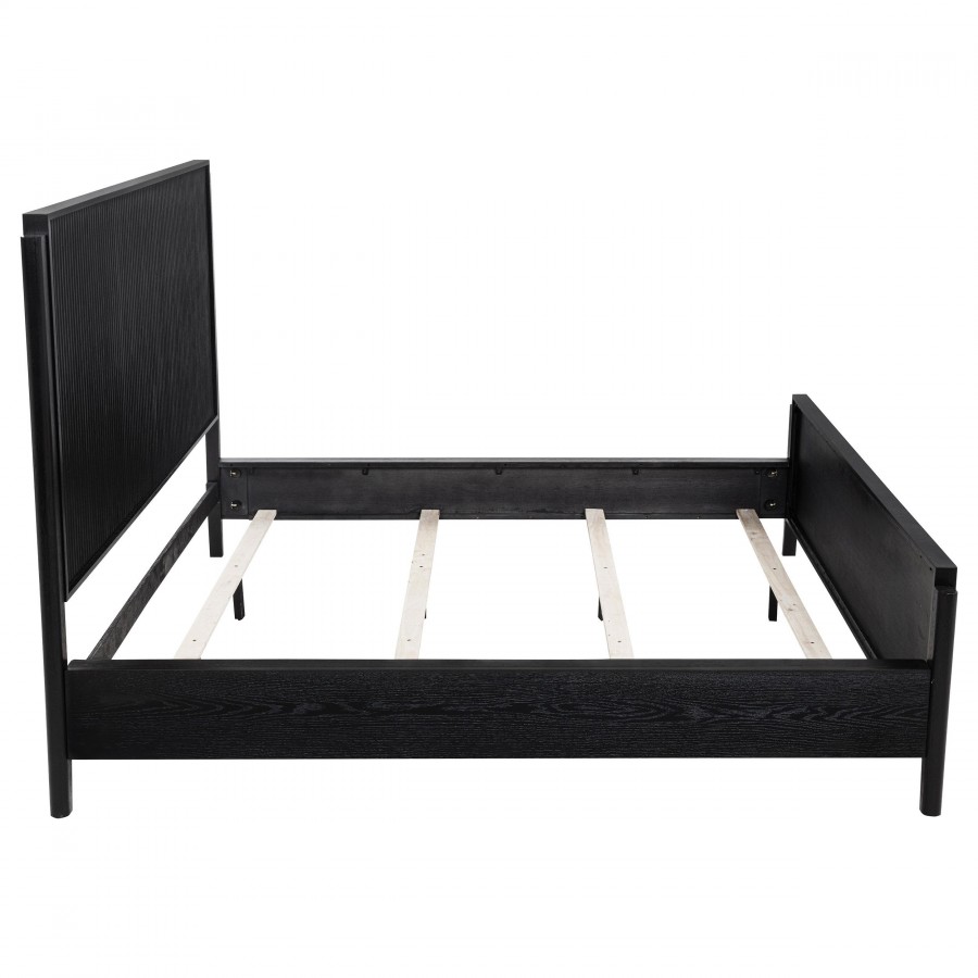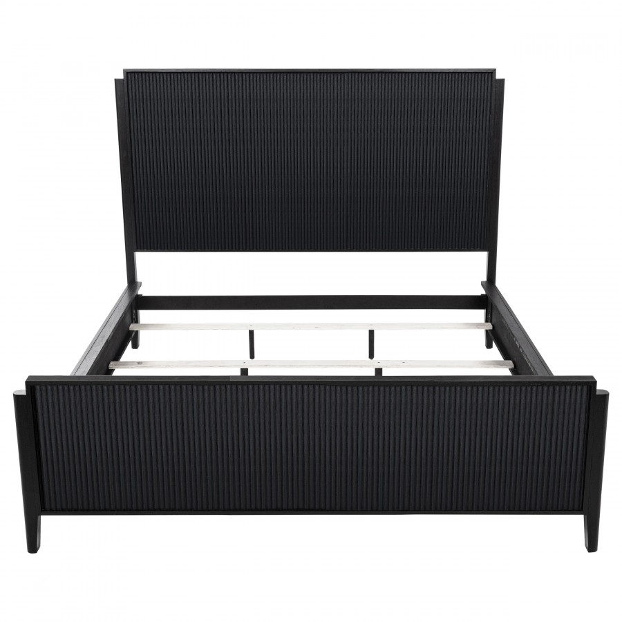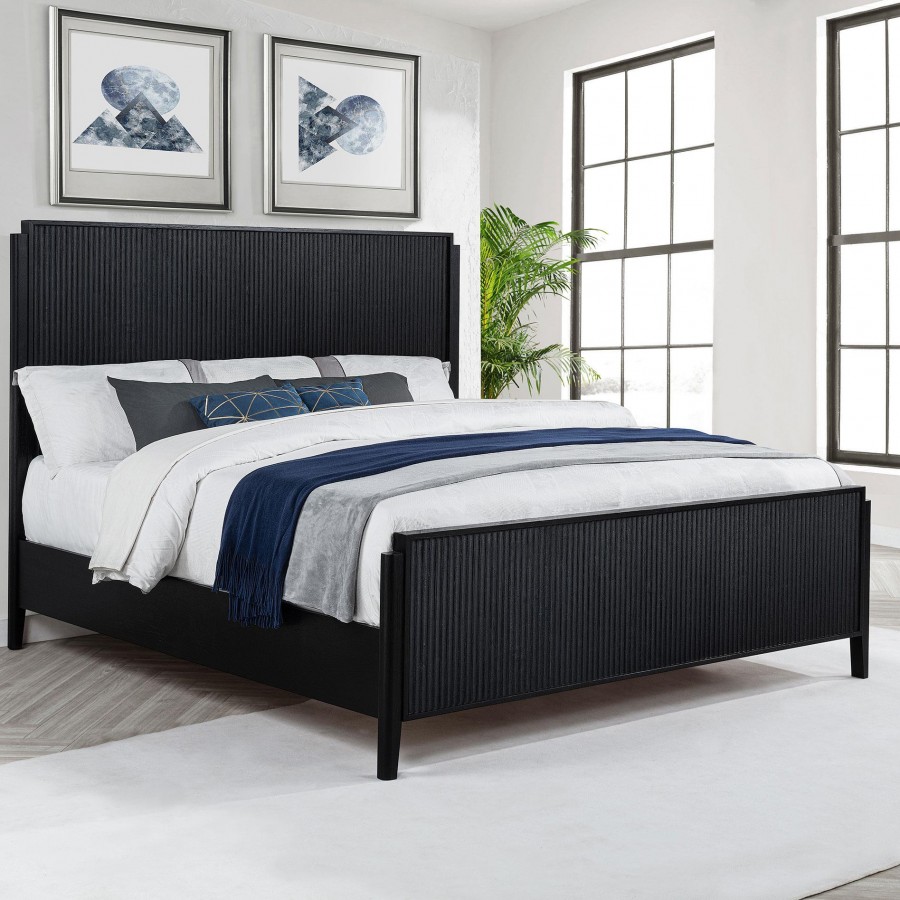 Instill a hint of drama in your bedroom with the rich black finish of a modern wooden bed. Designed to stand out, it features a timeless silhouette with a tall headboard and low footboard to create an open, airy look in your bedroom. The black finish is bold and deep, with wire brushing that creates a touch of texture to highlight fluted texturing that create wonderful dimensionality. The bed includes matching black rails for a tailored, cohesive look and feel. Slats and support legs are included, offering peace of mind for a stable night's sleep.