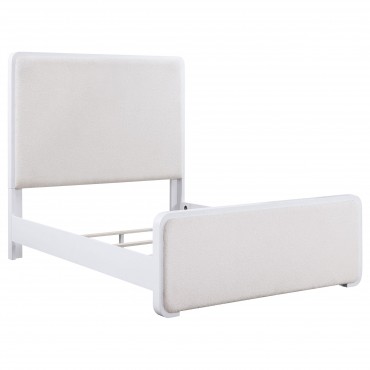 Center a stylish master or guest suite on this lovely modern wooden bed. In pearl white, it features a crisp, simple silhouette complete with rounded corners and an airy, modern look. The head and footboards are padded with foam for exceptional comfort when lounging. Light beige upholstery with texture completes the look with a touch of warmth, perfect for an inviting, neutral bedroom. Continue a monochromatic theme with matching linens, or add a splash of color with a vibrant quilt.