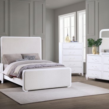 Center a stylish master or guest suite on this lovely modern wooden bed. In pearl white, it features a crisp, simple silhouette complete with rounded corners and an airy, modern look. The head and footboards are padded with foam for exceptional comfort when lounging. Light beige upholstery with texture completes the look with a touch of warmth, perfect for an inviting, neutral bedroom. Continue a monochromatic theme with matching linens, or add a splash of color with a vibrant quilt.