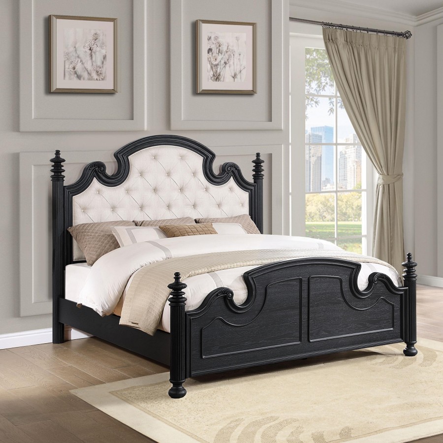 Immerse yourself in the opulence of this bed, with its tufted, upholstered headboard that beckons a regal night's sleep. The curvaceous silhouette, adorned with intricate woodworking and a dark, luxurious finish, stands as a testament to timeless design. This bed doesn't just anchor the room; it sets the stage for a chamber that's fit for royalty.