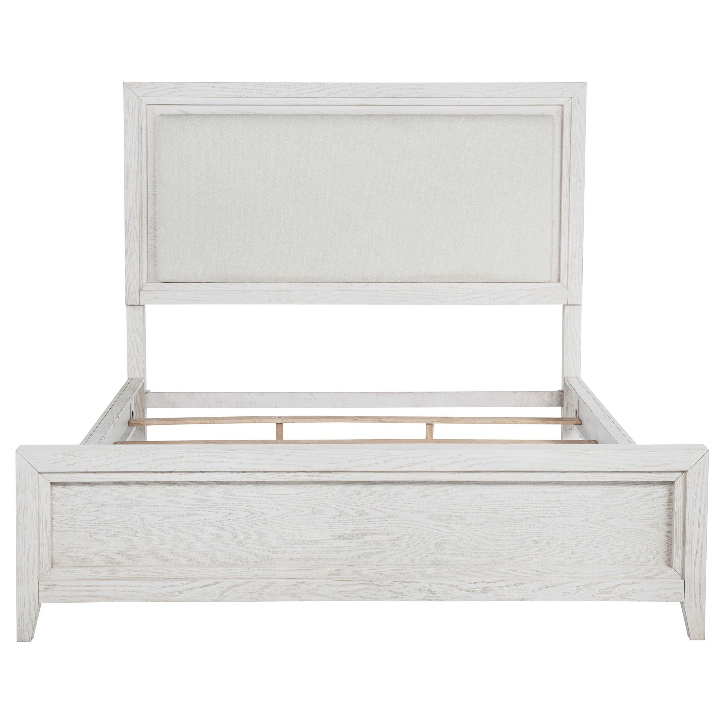 Refresh the look and feel of your bedroom with the inviting character of a modern upholstered bed. The bed features a wood frame in a distressed white finish that highlights its grain details. The headboard is a squared design complete with a padded panel upholstered in white for a monochromatic effect that's clean and contemporary. A low footboard completes the look and creates an open, inviting profile for your bedroom.
