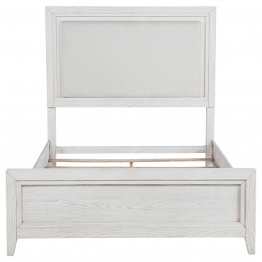 Refresh the look and feel of your bedroom with the inviting character of a modern upholstered bed. The bed features a wood frame in a distressed white finish that highlights its grain details. The headboard is a squared design complete with a padded panel upholstered in white for a monochromatic effect that's clean and contemporary. A low footboard completes the look and creates an open, inviting profile for your bedroom.