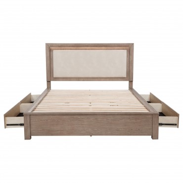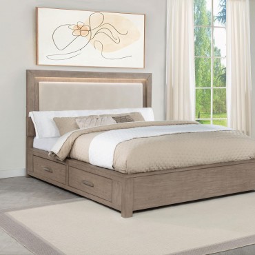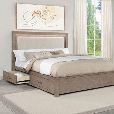 Make the most of every inch in your stylish bedroom with a modern four-drawer wooden bed that includes an upholstered headboard with LED lighting for easy ambiance. The bed boasts a barley brown finish over wood grain details, creating a soft, neutral palette with organic flair. Four drawers are tucked underneath platform slats, creating ample storage that's perfect for everything from clothing and linens to personal items. The bed is defined with a squared headboard that features an upholstered panel with foam cushioning and beige upholstery, perfect for lounging with a book or movie. Built-in LED lighting is a perfect complement, adding soft, inviting ambiance in your bedroom.
