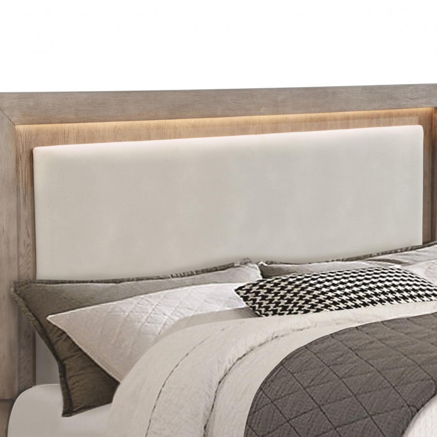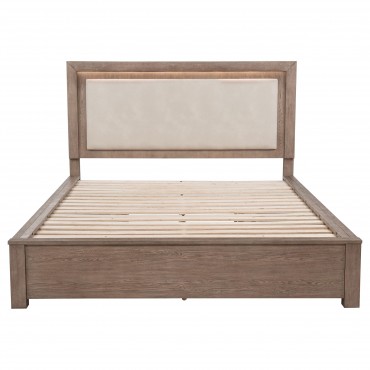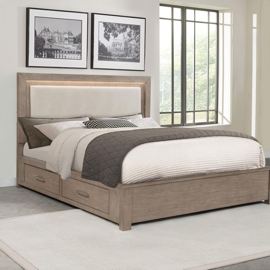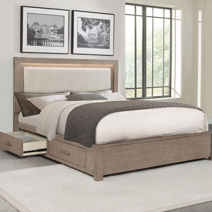 Make the most of every inch in your stylish bedroom with a modern four-drawer wooden bed that includes an upholstered headboard with LED lighting for easy ambiance. The bed boasts a barley brown finish over wood grain details, creating a soft, neutral palette with organic flair. Four drawers are tucked underneath platform slats, creating ample storage that's perfect for everything from clothing and linens to personal items. The bed is defined with a squared headboard that features an upholstered panel with foam cushioning and beige upholstery, perfect for lounging with a book or movie. Built-in LED lighting is a perfect complement, adding soft, inviting ambiance in your bedroom.