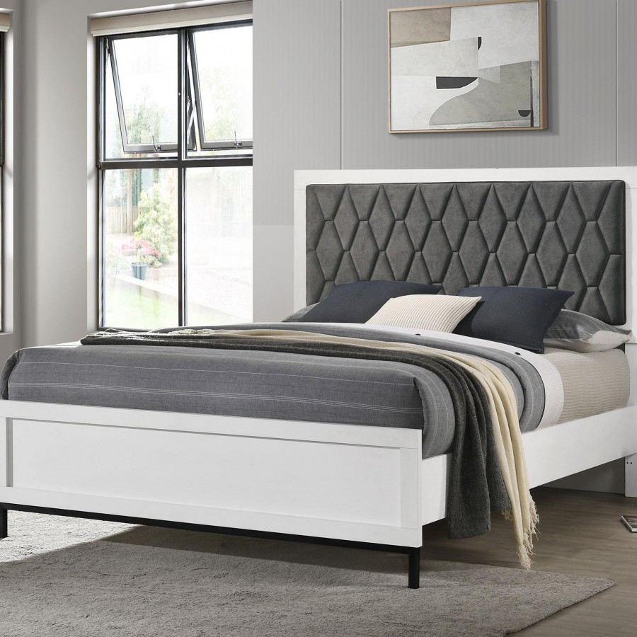 Bring geometric detail to your bedroom with the charming hexagon motif featured on this modern upholstered bed. Offering a contemporary look and feel, it creates a stylish focal point with its rich contrast of color and texture. The padded headboard offers excellent comfort and dark gray fabric upholstery. A streamlined wood frame adds a bright white finish to the rectangular head and footboards, creating an open, airy look. This stylish bed is complete with black accents in the base of the footboard and requires a foundation for use.