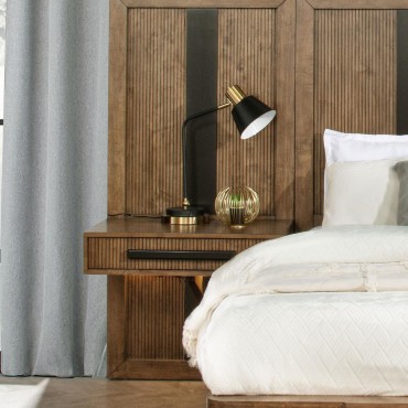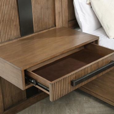 Bring grand scale and handsome elegance to your bedroom retreat with this three-piece modern bed and nightstand set. It centers on a storage bed with a tall headboard and adds two wall panel nightstands. Each includes one drawer and a design that echoes the headboard of the bed to create cohesion. The bed includes a low footboard with two storage drawers that are ideal for accessories and linens. A cool ash brown wood grain finish pairs with dark accents to create a fresh, contemporary look and feel.