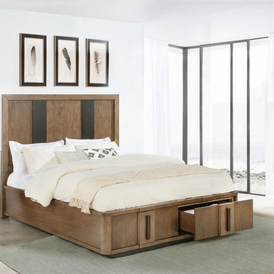 Sleek vertical embellishments create incredible texture and depth for a modern wooden storage bed. A pair of drawers are tucked in the footboard, which creates an open, airy profile with its low silhouette. The bed is anchored with a tall headboard, complete with mitered corners for sharp precision. Vertical fluting and dark brown panels add dimensionality, creating the perfect hint of contrast against a cool ash brown wood finish. Smooth side rails complete the look with tailored flair while a center rail adds plenty of support for the mattress of your choice (not included).