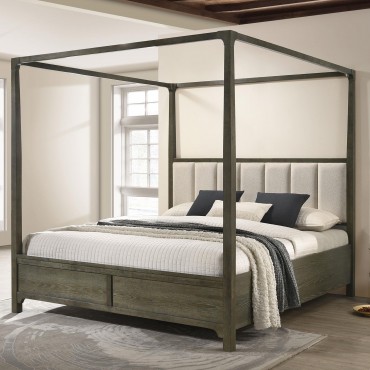 Transform your bedroom into a sophisticated retreat with this transitional canopy bed. Featuring rounded corners and trending design details, this bed offers a perfect blend of style and stability. The headboard is upholstered in textured beige fabric with vertical channeling, adding a touch of elegance. Finished in dark cocoa, the bed is crafted from solid hardwood and ash veneer, ensuring durability and a timeless look. Enjoy the luxurious feel and refined aesthetic of this beautifully designed canopy bed.