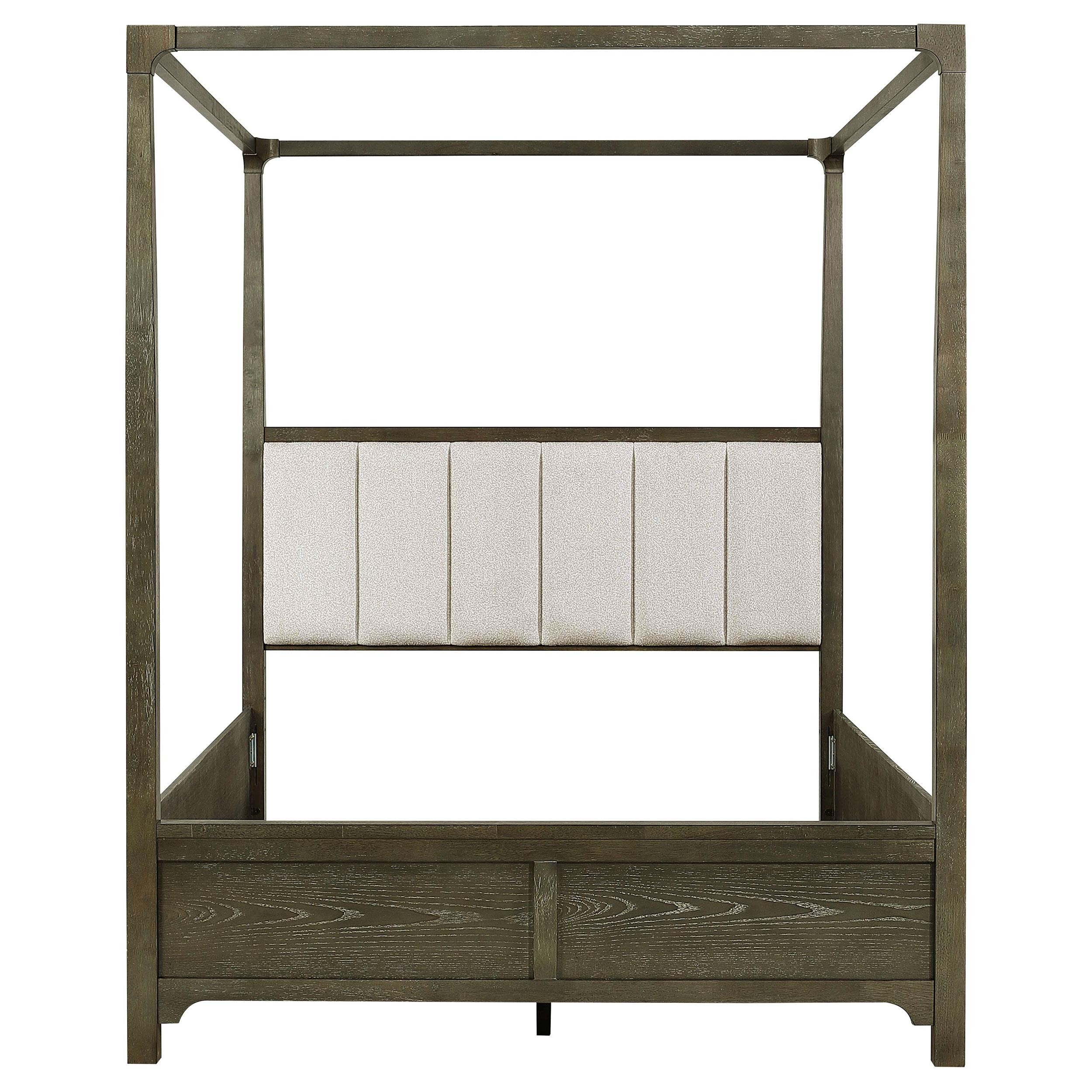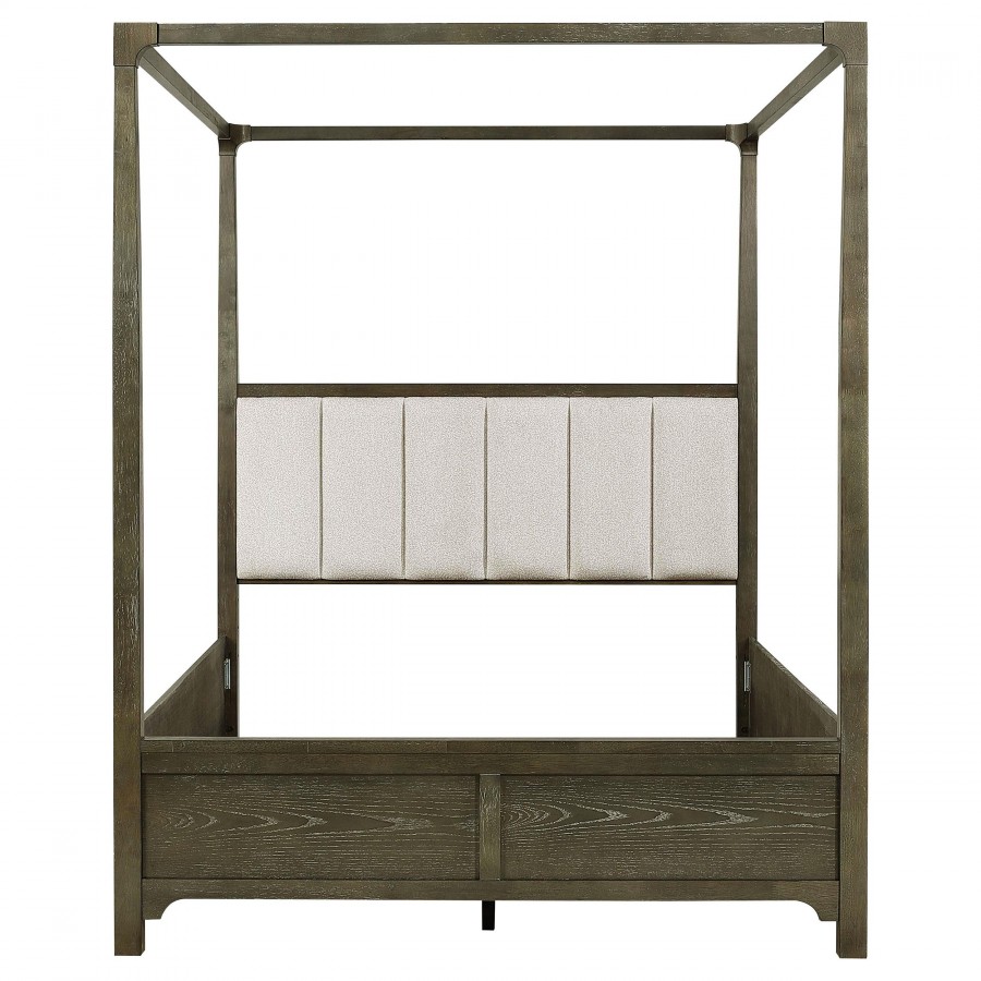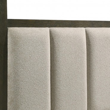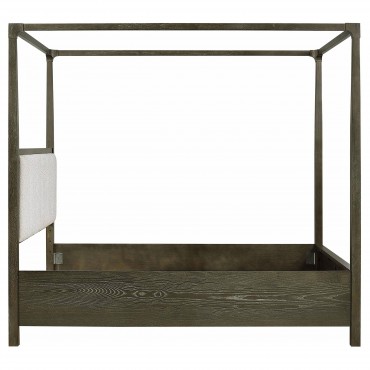 Transform your bedroom into a sophisticated retreat with this transitional canopy bed. Featuring rounded corners and trending design details, this bed offers a perfect blend of style and stability. The headboard is upholstered in textured beige fabric with vertical channeling, adding a touch of elegance. Finished in dark cocoa, the bed is crafted from solid hardwood and ash veneer, ensuring durability and a timeless look. Enjoy the luxurious feel and refined aesthetic of this beautifully designed canopy bed.