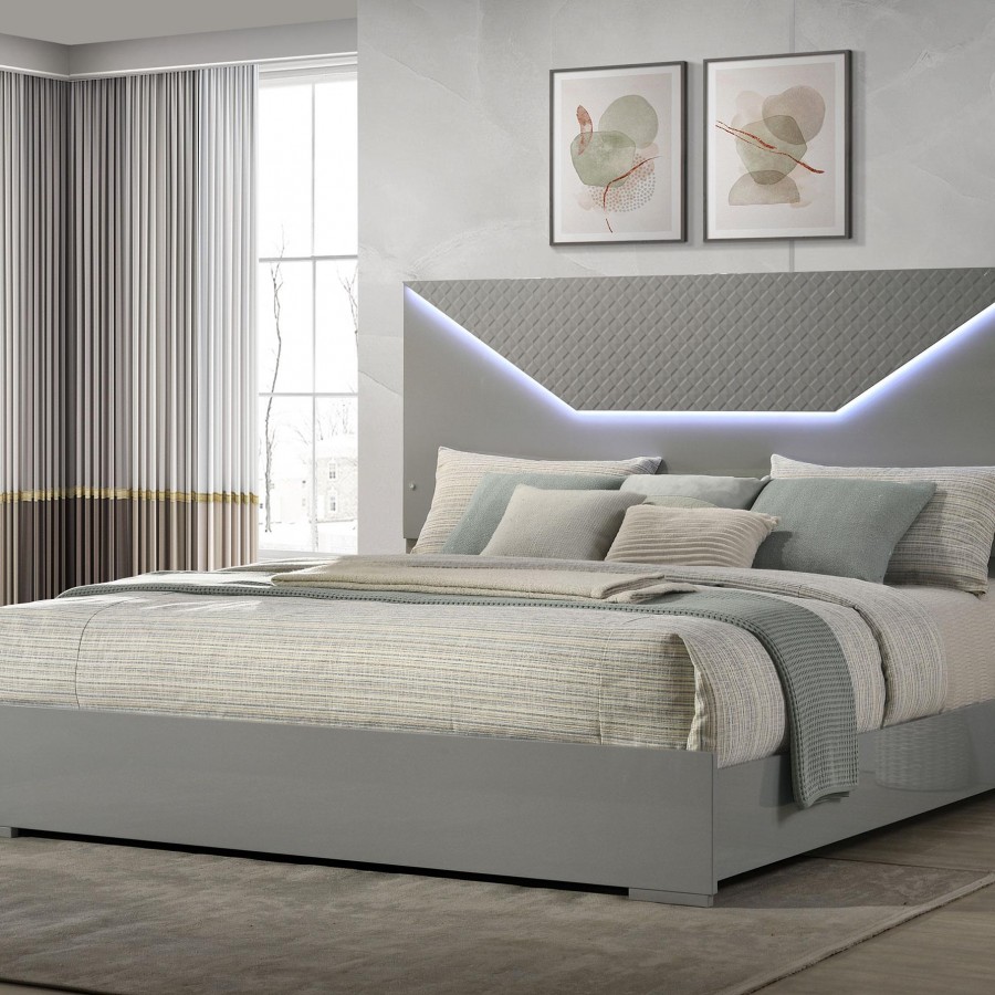 Ives Eastern King Panel Bed LED Headboard Grey High Gloss