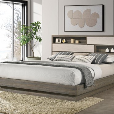 Discover contemporary elegance and smart design with this queen bed, part of a sophisticated bedroom collection. The bed features a stylish bookcase headboard with a hidden compartment, perfect for storing valuables or keeping bedtime essentials within reach. Crafted from durable melamine with a modern two-tone finish, this bed exudes both charm and practicality. Designed for lasting support, it offers a sturdy foundation for your mattress. Transform your bedroom into a haven of style and functionality with this innovative and elegant bed.